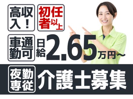 仕事内容 ■特別養護老人ホームにおける夜勤専従介護業務 ※2ユニット20名を担当 ※フロア固定 <主な業務> ・食事配膳下膳、食事介助 ・排泄介助、おむつ交換、リネン交換 ・環境整備 ・入居者様の見守り、コミュニケーション ・夜間帯、早朝の巡回 ・介護記録作成など <お仕事の1日のスケジュール例> 16:00~ 出勤、介護記録の確認、申し送り 17:00~ 夕食:食事介助、服薬介助、口腔ケア 18:00~ 就寝介助:居室へのご誘導、更衣、トイレ誘導、排泄介助 21:00~ 夜間帯見回り(パット交換、体位交換)、コール対応 00:00~ コール対応、介護記録作成、物品補充、休憩(2時間) 05:00~ 早朝見回り(必要に応じてパット交換)コール対応 06:30~ 起床介助:離床、更衣、トイレ誘導、フロアへのご誘導 07:30~ 朝食:食事介助、服薬介助、口腔ケア 09:00~ 申し送り、トイレ誘導、フロア対応 ~10:00 介護記録作成、ごみ捨て、退勤 <派遣先> 全50床ユニット型特別養護老人ホーム <通勤方法・その他補足> ※車通勤可能 <受動喫煙対策> あり(屋内禁煙) <新型コロナウイルス感染防止対策実施> マスク着用での勤務、アルコール消毒液完備などの感染対策をし、利用者様もスタッフも守れるよう体制を整えています。 ここがポイント ■日給2万6500円(初任者研修以上) ■16:30~09:30(実働15時間)勤務 ■週2回勤務よりご相談ください ■全50床ユニット型特別養護老人ホーム ■2ユニット20名を担当していただきます ■フロア固定 ■車通勤可能!
