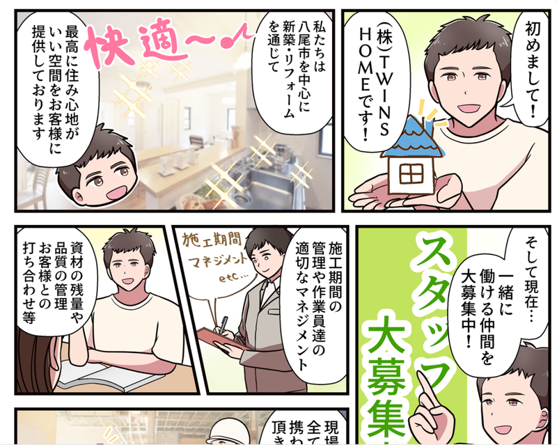 仕事内容 ★https://twins-home-lp.com/★ 上記URLからより詳しく弊社のことを 知っていただけるので是非一度ご確認下さい! 株式会社TWINS HOMEは、 大阪府八尾市を拠点に、 新築やリフォームの内装工事を 手掛ける企業です。 八尾市を中心に多くのご依頼をいただき、 安定した業務量を誇ります。 組織体制の強化を図るため、 新たなメンバーを募集しています。 ✨✨✨アピールポイント✨✨✨  ̄ ̄ ̄ ̄ ̄ ̄ ̄ ̄ ̄ ̄ ̄ ̄ ̄ ̄ ̄ ̄ ̄ ⭐未経験OK ⭐資格取得支援あり ⭐地域社会への貢献を実感 ⭐安定した業務量で安心 ✨✨✨具体的なお仕事内容✨✨✨  ̄ ̄ ̄ ̄ ̄ ̄ ̄ ̄ ̄ ̄ ̄ ̄ ̄ ̄ ̄ ̄ ̄ ✅新築・リフォーム現場での現場監督 ✅お客様や職人さんとのスケジュール調整 ✅施工進捗管理 ✅見積書・請求書の発行 ✨安心してスタートできる環境✨  ̄ ̄ ̄ ̄ ̄ ̄ ̄ ̄ ̄ ̄ ̄ ̄ ̄ ̄ ̄ ̄ ̄ 未経験でも安心してスタートできるよう、 先輩社員が一から丁寧に指導します。 資格取得にかかる費用は会社が負担し、 着実にステップアップできる 環境を整えています。 実際に、未経験から入社して、 資格を取得した先輩が多数活躍中です。 真面目に仕事に取り組む方、 この仕事をしたいという 熱意のある方のご応募お待ちしております!