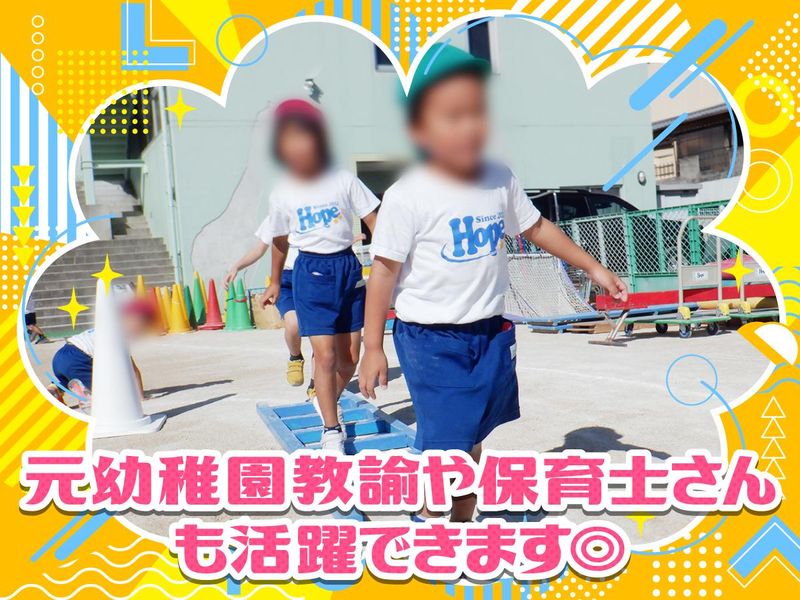 仕事内容 <<体育指導経験者求む!>> 幼稚園の体育教室の指導スタッフ 副業・Wワーク・定年後の方も歓迎◎ ✅体育指導経験がある方なら資格不問! ✅週1~4日・短時間のお仕事◎ ✅久々のお仕事復帰も歓迎! 火・水・木・金の週4日・午後の短時間! 週1日から相談OKです◎ 夏・冬休みはお休みですが 特別教室を行いますので 夏・冬休みは、数日の出勤になります◎ ==================== 【仕事内容】 ==================== 神戸市北区/長田区/西宮市内の幼稚園での 課外教室・体育教室のサポートスタッフ 幼稚園に通う子どもたちの体育指導を 担当していただきます。遊びながら 身体を動かす楽しさを伝え、子どもたちの 成長をサポートするお仕事です。 楽しく、やりがいのある環境で 子どもたちの体力づくりをお手伝いしませんか? *運動遊びや跳び箱、 マット運動などの体育指導 *レクリエーション指導 *道具の準備・片づけ・掃除など 子どもたちと一緒にクリスマスの製作をしたり、レクリエーションの時間も楽しいですよ◎ ・指導スタッフ1名+補助スタッフ1~2名の 2~3名程度で指導を行っています。 ・幼稚園へ直行直帰でOK ==================== 【勤務先・勤務時間】 ==================== 火・木 /13:00~18:00(北区の幼稚園) 金曜日 *2026年3月まで 12:50~16:30(長田区の幼稚園) 月曜日 *2026年4月から 12:50~16:30(長田区の幼稚園) 水・金 *2026年4月から 13:30~16:30 or 13:30~18:00 (西宮市甲子園の幼稚園) 勤務曜日・日数相談OK!