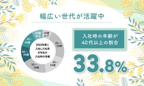 職場環境 【従業員構成】 当社社員の入社時の平均年齢は【34.5歳】(2023年度) 自分自身の新しい人生を歩みたい方を大同生命は応援します! 「家庭に専念していたが復職したい」 「子育てと両立し働きたい」 などの理由で入社される主婦・子育てママさんが多数います。 【この仕事を通して身に付くこと】 「働きやすさ」「長く勤めている女性の多さ」「年齢不問」という点に魅かれて入社した人が多数! 未経験でも活躍できている理由は、研修制度にあります。 ビジネスマナーや税務、マネジメントなど、年次・役職に応じて種類豊富にご用意。さらに、PCで視聴できるなど、個々人の必要に応じて学べる環境を整えています。 また、資格取得も推奨。「ファイナンシャル・プランニング技能士」3級はプランナーの6割が取得済です。