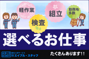 募集背景 登録者大募集!! 仕事内容 【お仕事】 ★組み立て ★検査 ★物流(リフトの経験者は優遇) ・どのお仕事も、未経験スタートの方多数なので安心 <他にもこんなお仕事あります> ★事務 ・経理事務 ・一般事務 ・人事スタッフ ※入力出来ればOK、Excelの基本操作が出来ればOKなど色々な事務があります ★軽作業 ・部品の個数の確認 ・伝票を見ながら必要な部品を必要な数取り台車に乗せる(準備作業) ★マシンオペレーター ・部品の交換や、機種の切替、マシンのエラー解除 色々なお仕事多数あり!ご相談ください! ◆長期・短期のお仕事あり ◆日勤・夜勤・交代勤務から選べます ◆未経験歓迎のお仕事多数! ◆当社スタッフ多数活躍中!! ◆定着率バツグンで人気のお仕事ばかりです♪ [こんな人が活躍] <20代、30代、40代、50代の男女スタッフ多数活躍中>
