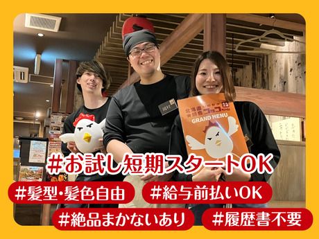 その他 未経験OK、大学生歓迎、フリーター歓迎、主婦・主夫歓迎、午後のみOK、短時間OK、長期歓迎、平日のみOK、土日祝のみOK、週1、2日からOK、週3日以内OK、週4日以上OK、シフト制、昇給あり、交通費支給、時給1000円以上、制服あり、髪型自由、駅チカ・駅ナカ、履歴書不要、大量募集、食事補助あり、副業OK 【ブランド名】 いただきコッコちゃん 【事業内容】 炭火で焼く焼鳥をメインに、唐揚げや卵料理までリーズナブルに楽しめる小洒落た居酒屋