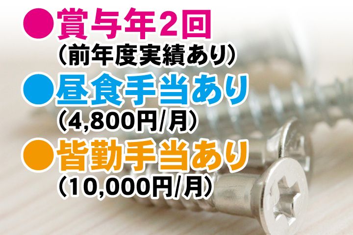 仕事内容 ほぼ全員が製造未経験からのスタートです! 残業なし!日勤・土日祝休みでプライベートも充実! 30代・40代の男女活躍中!若手人材も積極的に採用中! ▼この募集のポイント 〇未経験者大歓迎! 〇残業なし 〇日勤・土日祝休み 〇賞与年2回(前年度実績あり) 〇昼食手当あり(4,800円/月) 〇皆勤手当あり(10,000円/月) ▼カンタン機械オペレーター 金属ねじを機械で作る製造作業です。 機械の操作や完成品のチェックなどをお任せします。 専用の機械で作業するからカンタン! 先輩スタッフもみんな未経験から始めました! ▼ほぼ100%の方が未経験スタート 当社で働くほとんどのスタッフは未経験からスタートしました。 丁寧な研修があるから安心!社会経験が少ない方も大歓迎! 定着率が非常に高いのが特徴です。 穏やかな雰囲気の職場で、皆さん長期で活躍しています! ▼身体に無理なく長く働ける 日勤固定で残業なし!毎日決まった時間に帰れます。 しかも土日祝休み!2025年度の年間休日は120日以上を予定してます! 賞与年2回支給あり!昼食手当・皆勤手当あり! 育児休業・介護休暇制度や退職金制度もあり! 正社員として安定して働ける環境が整っています。 ▼こんな方におすすめ 〇未経験から新しい仕事を始めたい方 〇既卒・第二新卒の方 〇工場内作業や製造業の経験ある方 〇コツコツ作業が得意な方 〇無理なく長期で働きたい方 ▼お電話でのお問い合わせはこちら TEL. 029-864-0231 受付時間:平日8:30〜17:30 ※WEB応募は24時間受け付けています。