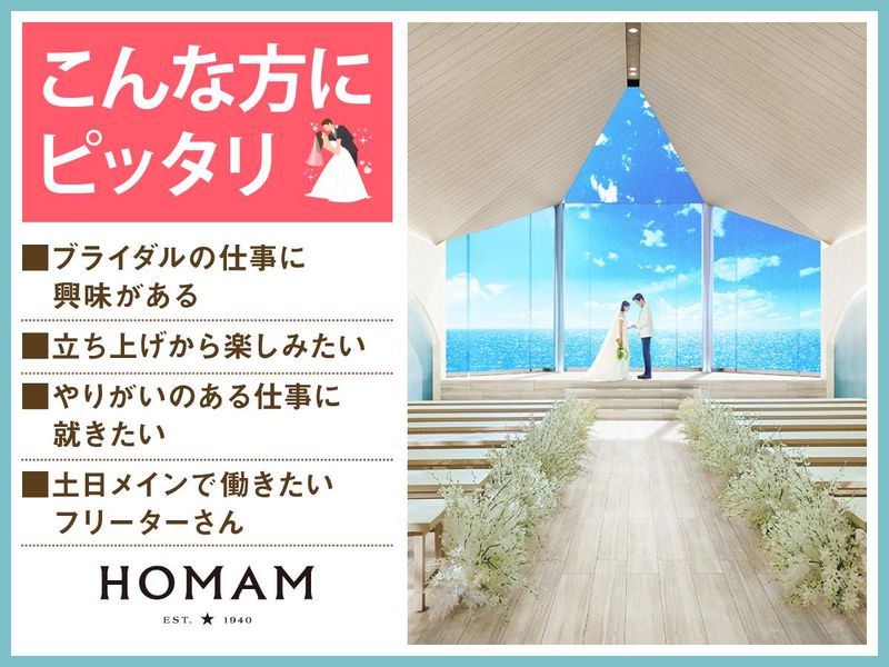 仕事内容 *駿河湾を望む絶景の結婚式場* 2026年3月オープン予定の新しい式場で、 オープニングスタッフを募集♪ 感動いっぱいの結婚式を⼀緒にサポート♪ ◎週3日~・1日5H~◎副業OK! ◎絶品のまかないアリ(^^) 「⼈が喜ぶ姿が好き」 「人のサポートが得意」 という⽅必⾒︕ スキルや経験は⼀切不要♪ ⼀緒に素敵な結婚式を演出しましょう* HOMAM 旧マッケンジー邸は 国登録有形文化財の洋館と調和した 駿河湾の絶景を一望できる クラシカルな結婚式場です! 今回は 「アシスタントプランナー」を募集! プランナーがスムーズに業務を 進められるようサポートします。 <主なお仕事内容は…> 結婚式場スタッフとして 次のお仕事をお任せ ■新郎新婦様のご案内や来客対応 ■会場見学のサポート ■事務作業、電話対応 ――――――――――――――― 具体的なお仕事の流れは︖ ――――――――――――――― ▶事務作業・電話対応 お客様からのメール対応 パートナー企業様への業務連絡 WEB媒体の操作(予約管理や口コミ返信) ▶来客・受付対応 打ち合わせにいらっしゃった 新郎新婦様のご案内や来客対応! ドリンクやお茶などをお出しします◎ ▶会場見学のサポート 新郎新婦様が快適に見学できるように 会場をご案内する際に扉を開けるなどのサポート! 会場見学が一通り終われば、 もう1度ドリンクを出してお見送りします◎ ⇒まずはカンタンなお茶出しなどからお任せするので未経験の方も安心です♪ ―――――――――――――――― フリーターさん大歓迎! オススメのポイントはこちら★★ ―――――――――――――――― ・立ち上げから一緒に創り上げる楽しさ! ・オープニングだから上下関係なし! ・週3日~1日5時間~OKで融通◎ ・かけもち・副業OK! ・シェフが腕を振るう絶品まかないアリ(^^) まかないは本格料理人たちが 美味しい食材を使って作ってくれます♪♪ ―――――――――――――――― 未経験者歓迎! 記憶に刻まれる結婚式場を、 みんなで創り上げましょう* ―――――――――――――――― 新式場での営業開始に向けて、 最初は研修からスタート! 丁寧な所作や言葉遣い、マナーまで 身に付けながら実践力を養います。 不安がなくなるまで、 スタッフ全員でサポートします◎