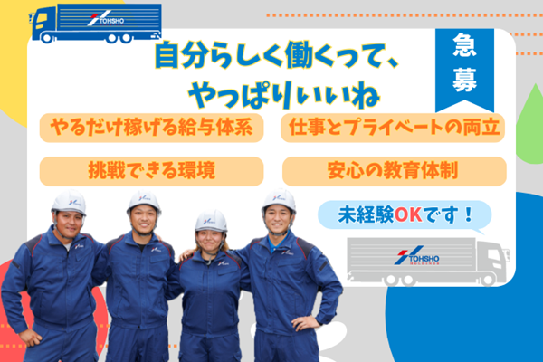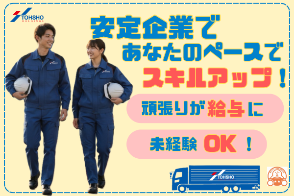 仕事内容 =============== 高収入!毎日日帰りOK! 2t・3tトラック運転手募集! ■入社後に特別賞与20万円支給! ■免許取得支援制度あり! ■手積みなし&荷降ろし補助あり! =============== 【この仕事の魅力】 ◆毎日日帰りOK! 長距離運転なしの近距離配送だから、毎日家に帰れます。早上がりも可能で、お昼ご飯の時間もしっかり確保◎15時退勤の日もあります!集中力を保ちながら働ける環境です。 ◆自分専用トラックで快適! 全車デジタコ・ドライブレコーダー・バックアイモニター完備。一人一車制なので、いつも同じトラックを使用できます。 【仕事内容】 ①建築資材(石こうボード)を東京都多摩地区内の建築現場や材木店、ホームセンターなどに配送するお仕事です。配送エリアは営業所から1時間以内の範囲で、1日あたり1~3便(1便につき1~3件)となります。 引っ越しバイトや社員の経験がある方は即戦力としてスグに活躍出来ます! ◆手積みなし&荷降ろし補助あり! 積み込みは専属リフト作業員が対応。荷降ろしは現場スタッフが手伝ってくれるので安心です。さらに、手降ろし作業が発生する場合は「荷降ろし手当」を支給します! ◆「もっと稼ぎたい!」も叶う! 基本は1日1~3便の運行です。2024年問題で収入が減った現役ドライバーさんも大歓迎!収入アップを目指せます! ━━━━━━━━━━━━━━━━━━━ ②建築資材全般の現場配送となります。 配送エリアは東京、埼玉、埼玉(30km圏内)です。 ◆土日祝休みで自分の時間を大切にしたい方にピッタリ! ━━━━━━━━━━━━━━━━━━━ 【働きやすくしっかり稼げる職場】 先輩ドライバーの方はみんな優しく教え好き(笑) 経験の少ない方も丁寧な指導で、一人前のプロドライバーになれます! 経験者優遇&未経験者歓迎!免許取得支援制度もあるので、資格がない方でも安心して始められます。有給休暇も取りやすく、家族との時間や旅行などプライベートも充実可能です。 「もっと稼ぎたい」「初心者だから少なく」など、配送件数の相談もOKです! ==================== 【創業60年のトーショーグループに関して】 1964年の創業から60年と長く安定している業界有数の運送会社です。 全国各地で事業を展開。 現時点でグループ全体で34拠点を有し、社員数は800名以上。 大手荷主とお取引が多く、取り扱う商材等の関係から仕事量が安定しています。 また物流だけでなく、旅客や引っ越し、 保険・物販といった多種多様な事業も展開しております。 ≪転職を迷っている方も気軽にご相談ください!≫ ■勤務地:株式会社トーショー 多摩営業所 ※お車での来社もOKです! ▽お電話での応募も大歓迎▽ TEL:042-476-3300