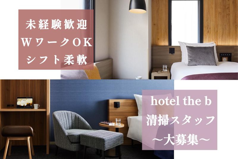 仕事内容 ―+ お仕事内容 +― *お部屋全体の掃除 *ごみ回収 *ベッドメイキング *リネン準備 *水回りの清掃(ユニットバス等)などをお任せします◎ ―+ 詳細Q&A +― Q:実際に使う道具は? A :セットするアメニティ・清掃敷材(洗剤・スポンジ・ブラシ等)を入れたカゴ Q:どれぐらいのサイズのフロア? A:地上8階建て、ワンフロアあたり約14室 Q:1人1日あたりの対応客室数は? A:約7~10室/1日 Q:客室の大きさは? A9~22㎡/1室 Q:客室数にノルマは? A:ノルマなし! *既存メンバーは 30~40分/1室で業務遂行! \ スタッフに聞いた / 「この仕事のやりがい&おすすめポイント」 ✅自分の作業によって、目に見えてキレイになった空間を見ると、 毎回すっきりした気持ちになれます! ✅私は人見知りなので、一人作業が多くモクモクと作業ができることが嬉しいです。 また、適度に体を動かせるので、運動不足解消・健康維持にも繋がっていると思います! ✅オープニングなので、未経験の方も安心してスタートできます! イチから丁寧にサポートします♪ ▼ こんな方にオススメ ▼ *体を動かすことが苦にならない方 *コツコツと作業をするのが好きな方 *未経験から安定した仕事に就きたい方 *土日に働ける仕事をお探しの方 *かけもちできる仕事をお探しの方 など◎ ▼ ”the b hotel s” について ▼ 全国主要都市の交通利便性に優れた、魅力的なエリアを立地とした都市型ホテル「the b hotel s」 お客様が無料で自由に軽食を楽しめる「tottette」や無料エスプレッソサービスも大好評♪ 質の高いホスピタリティ・サービスにより高評価多数の話題のホテルです!