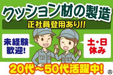 仕事内容 新着:製造スタッフ募集(No.514) 工場内でウレタン製品の加工・検査・ 仕上げ・梱包作業などを行います。 <未経験者大歓迎><土日休み> 20代~50代の男女活躍中! 【ポイント】 ・未経験歓迎! ・ブランクOK、経験者優遇 ・週休2日の土日休み ・希望の時間帯の専属勤務! ※交替勤務なし ・昇給あり ・正社員登用制度あり ・週払いOK ・仮払い制度あり ・社員食堂あり(食券制 定食350円~) ・若手から中高年までの幅広い世代活躍中 【仕事内容】 生産ラインの製造工程業務です。 難しい作業なしで未経験者も大歓迎! 自動車の座席や生活用品・梱包材などに 使われるポリウレタン製クッションの 製造や加工、仕上げ、検査を中心に その他付帯作業を行います。 研修制度や先輩スタッフの指導があるので 不安なく始められる環境です。 初めての方も安心してスタートできます。 【勤務について】 7時~16時の日勤専属または16時~翌1時の 準夜勤専属のどちらかを選べます。 準夜勤の勤務開始時間は後ろ倒しで、 遅くなる場合があります。 交替勤務はありません。 土日休みの週休2日で、GW、夏季、 年末年始休暇もあるので、プライベートも 大切にできます。 ・製造業は未経験だけどチャレンジしたい! ・接客業や運送業などの異業種から転職を検討中 ・主婦パートとして倉庫内軽作業の経験がある ・工場内作業をしていたがブランクがある ・モノづくりや工場の仕事に興味がある ・コツコツモクモク作業が得意! ・ハローワークで長期の仕事を探していた という方も大歓迎! 正社員登用制度でキャリアアップも可能です。 派遣で働くのが初めての方もお気軽に!! アルバイト・パート・フリーター・ 契約社員の方もご検討ください。 長期で安定のお仕事です。 お電話またはWEB応募よりご連絡ください。 入社日等も相談に応じます。 気になる点やご不明点等のお問合せも歓迎です。 【電話応募・お問合せ先】 TEL.0120-295-018 TEL.04-2953-8321 (受付/平日9:00~17:00 ※土日祝除く) 【採用サイトURL】 https://entori.jp/daiko-succeed