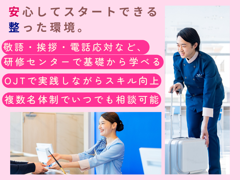 職場環境 ◎男女問わず20~30代が活躍中! ◎常時安心の2人体制 わからないことはいつでも聞ける環境 ◎9割以上未経験スタート 充実研修でフロントデビュー ◎2022年「女性活躍推進法」に基づく優良企業として「えるぼし」認定。 最高位の3つ星獲得!