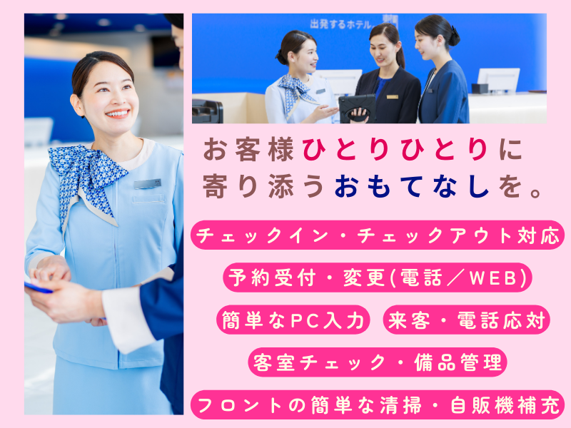 仕事内容 ╭━━━━━━━━━━━━━━━━━╮ ✨週2回勤務でも正社員、暮らしを整える ╰━━━━━━━v━━━━━━━━━╯ 東横INNのフロントスタッフは、 週2回勤務でも正社員。 賞与・手当・各種福利厚生はそのまま。 1回の勤務でしっかり働いたら、 その後は【2連休】で完全リフレッシュ。 年間休日はなんと169日以上! 平日の昼間も、趣味や勉強、 推し活に時間を使える―― そんな新しい働き方がここにはあります。 ╭━━━━━━━━━━━╮ ✨フロントスタッフの仕事 ╰━━━━━v━━━━━╯ 2〜3名のチームで分担しながら、 ホテル運営をサポートしつつ、 日本ならではのおもてなしを実践します。 ▼チェックイン/チェックアウト対応 (日本語でのご案内が中心。) ▼電話やWebでの予約受付 (丁寧な言葉づかいで安心感を提供) ▼客室チェック ▼アメニティ補充、ロビー清掃 ▼売上入力や日報作成などの簡単なPC業務 未経験スタートの先輩も多く、 研修やOJTが充実。 接客マナーや日本的な ホスピタリティを身につけながら、 事務や接客経験を活かして 無理なくステップアップできます。 ╭━━━━━━━━━━━━━━━━╮ ✨休みが多いから、生活も趣味も充実 ╰━━━━━━━v━━━━━━━━╯ 1回の勤務毎に2連休が手に入る。 そのおかげで、こんなことも可能です。 ▼平日の昼間にカフェや映画、ジムに行く ▼推しのライブやイベントに遠征 ▼資格の勉強に集中 ▼友達とのドライブや地元散策 ▼「今日は何もしない日」も選べる幸せ 「休みが多い=人生の選択肢が増える」 そんな感覚を実感できる働き方です。 ╭━━━━━━━━━━━━━━╮ ✨働き方もキャリアも、自分次第 ╰━━━━━━v━━━━━━━╯ 好きな街でのんびり…だけじゃない。 自分の時間も、仕事のやりがいも、 どちらも手に入れる―― そんな新しい正社員の形を、 東横INNで始めてみませんか? This position does not require the use of English. All interactions with guests will be conducted in Japanese.