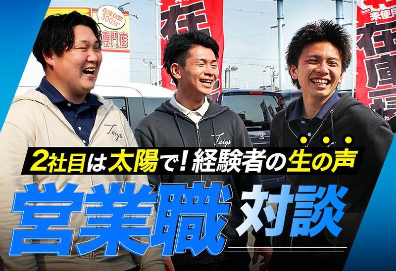 求めている人材 \人と関わることが好き、そんな方必見!/ 前職がサービス業・製造業など ”営業経験ゼロ”の社員が大勢活躍中! 【必須】 *普通自動車運転免許(AT限定可) 【営業未経験者歓迎】 *学歴不問・経験不問・年齢不問です! *必須条件以外の資格不要(無資格歓迎) 【男性・女性活躍中】 *フリーター歓迎 *第二新卒歓迎 *ブランクOK・ブランク歓迎 <こんな方にオススメしたい!> ・とにかく人としゃべることが好き! ・よく周りから相談事を持ちかけられる ・個人プレーよりもチームプレーが好き ・分からないことは素直に聞くことができる ・仕事も私生活もどっちも諦めたくない! 【こんな職種に興味/経験のある方】 提案営業/法人営業/ルート営業 不動産営業/リフォーム営業 など ========== \社員インタビュー/ ========== 「もっとコミュニケーションを活かしたい」 と思って入社した太陽自動車。 お客様とちゃんと向き合って、対話して・・・ しゃべることが好きな自分には ここでの営業の仕事はピッタリでした! 社内の雰囲気は驚くほどに明るくて、 社員同士、一緒に出かけたりと仲がいい。 僕たちの提案で、お客様の不安や悩みを、 解決できるというやりがいはもちろん、 チーム全体でもっと良くしようっていう 会社の雰囲気も自分には合っていますね。 入店した瞬間の「いらっしゃいませ!」は まさに、太陽自動車の”元気さ”の表れ。 ぜひ、面接時に体感してほしいです!!