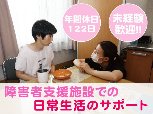 仕事内容 八王子市で生活支援スタッフを募集! 40・50代・60代スタッフが活躍中! 自立した利用者さんが多く利用者さんが安心して 1日を送れるようにサポートお願いします。 採用枠残りわずか!あと3名のみ募集中! 迷っている方、お気軽にご応募ください! 〈生活支援員のポイント〉 正社員※安定した働き方 手当充実! 年間休日120日以上 未経験OK 中高年・シニア世代も活躍中 女性スタッフも多数在籍!安心して働けます 利用者さんは自立した方が多く、介助も少なめ シフトの希望休OK!予定が立てやすい 〈生活支援員のお仕事内容〉 障害者支援施設 愛幸にて 知的障がいのある利用者さんの 日常的な生活(食事や入浴・排泄の介助)、 レクリエーション活動のサポートをお願いします。 具体的には、 ・食事のサポート ・トイレ誘導 ・着替えのサポート ・レクリエーション活動や 作業のサポート ・外食時の付添 利用者さんが「自分では難しいな~」と 思うことのサポートをお願いします。 <勤務シフト例> 月曜日/早番7:00~16:00 火曜日/早番7:00~16:00 水曜日/遅番12:00~21:00 木曜日/遅番12:00~21:00 金曜日/夜勤21:00~翌7:00 土曜日/休み(明け) 日曜日/休み といったシフトで働くことができ、負担も少ないです。 まずはお気軽にお問合せください!