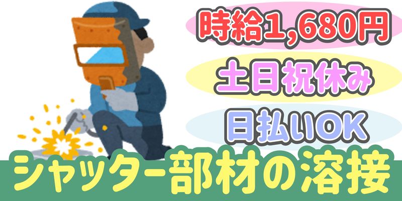 仕事内容 ドアなどを製造する企業でのオシゴト シャッター部材の溶接作業をお願いします 分からないことは教えてもらえるので安心です 出張面接いたします!就業前の職場見学OK! まずは、ご応募から!お待ちしております! 20歳~40代前半の男性活躍中 ・就業先は児玉工業団地内 オススメpoint ・人気の土日祝休み ・午前、午後に小休憩あり こまめに休憩できる環境です ・作業着はうれしい無償貸与 ・食堂あり(1食320円) もちろん持参もOK ・ロッカー完備 ・駐車場あり らくらくマイカー通勤 ・アーク溶接資格お持ちの方 ・未経験者OK ・土日祝休みが良い方 ・日勤のお仕事ご希望の方 ・長期で働きたい方 ・高時給のお仕事お探しの方 ・1月あたりの平均残業時間20h 【こんな経験活かせます!】 パート、アルバイト、契約社員 雇用形態問わず、下記の経験ある方は活かせます! ・工場 ・製造 ・加工 ・溶接 ※もちろん必須ではありません! まずはお気軽にご応募ください ///////////////////////////////////////// (WEBでご応募の場合) お電話番号を記入していただくと ご案内がスムーズです。 /////////////////////////////////////////