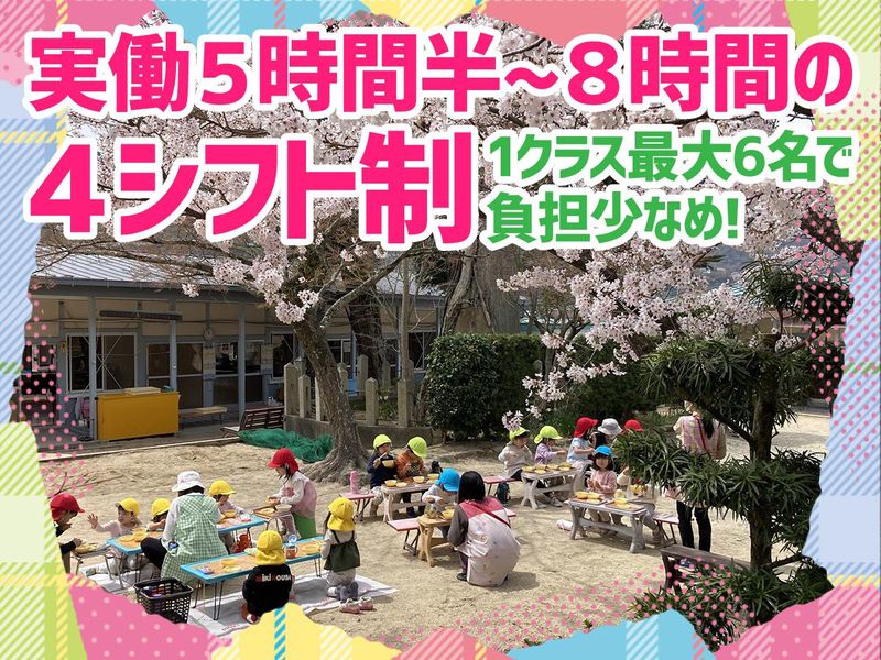 仕事内容 * 年間休日120日・週休2日制 * 小規模認可保育園 * "みんなの顔がわかる” 保育園 - 名塩保育園は、 西宮市名塩の「教行寺」の境内にある 定員30名のちいさな保育園。 1クラス最大6名という 小規模だからこそ こどもたち、保護者さま、職員… 全員が "みんなの顔がわかる” きめ細やかな保育を一緒に始めませんか? ――――【お仕事内容】―――― 保育業務をお願いします。 様々なカリキュラムで子どもたちと 深く関わります。 ・運動あそび ⇒マット・鉄棒・ボールなどを使用 ・音楽あそび ⇒うたを歌ったり楽器を楽しんだり… ・文字や数字に意識した学びの時間 ・食育のためのクッキング体験 ・お野菜・お米の栽培 など ※特別講師を招き、 「あそび」を通じておこなう体験も! / 名塩保育園で働く魅力3選! \ ★No.1 - 週休2日制・年間休日120日以上 1クラス最大6名だから負担少なめ◎ - 園児数が少ないので書類仕事も少ないです。 土曜出勤や毎年日曜開催の運動会後は 必ず平日に振替休日を取得! 行事ごともこれまでのノウハウで、 無駄な残業がありません◎ ★No.2 - 少しずつステップUPでOK! 保育士としての成長をフォロー - 初年度は複数担任のクラスを持ち、 先輩スタッフからOJT形式で 業務に慣れて頂けます。 基本的なことはマニュアルも完備! 全職員、講師の先生に 月1回ピアノレッスンを受講。 業務時間内に1人ずつ受けられるので、 ピアノが苦手でも安心です◎ ※他、私立保育協会の研修会も有り! ★No.3 - 子どもたちの個性をのばす カリキュラムが盛りだくさん! - 「おんがくあそび」「うんどうあそび」など、 園外から専門講師を招き、子ども達と一緒に 職員も楽しみながら学びを深めています。 子ども達に偏りなく様々な体験をしてもらいたい。 一人ひとりにじっくり関わりたい。 そんな方はきっと充実感のある環境です!