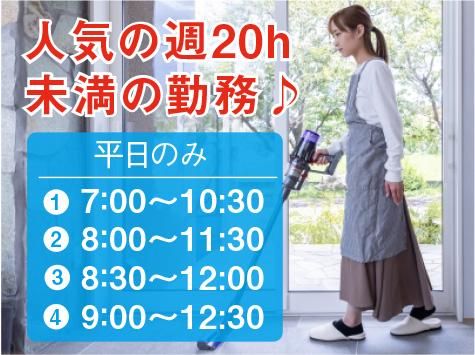 シフト制 勤務時間詳細 【選べる希望の時間帯】 ①7:00~10:30/3.5h ②8:00~11:30/3.5h ③8:30~12:00/3.5h ④9:00~12:30/3.5h ★月~金曜/週5日(祝休) 【休日・休暇】 完全週休2日(土・日・祝日) GW・年末年始休暇あり ★年間休日120日以上 ★☆人気の週20h未満の勤務☆★ 社会保険加入不要▶法定通り! ◎WワークもOK♪