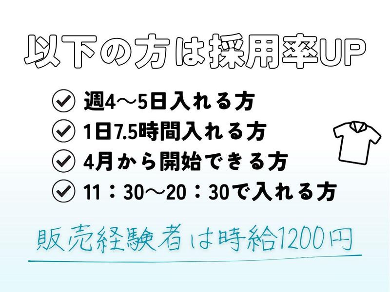 求めている人材 ◎社会保険完備 ◎交通費全額支給 ◎お試し短期からのスタートOK ◎長期契約への切り替えOK ◎遅番固定できます 必須条件:対人業務OKな方 ※接客販売業のため会話NGな方にはオススメできかねてしまいます 歓迎条件:笑顔で挨拶できる方 →明るくお客様をお出迎えできる方は大歓迎! →販売経験者は時給\1,200 〈通勤について〉 交通費全額支給 車通勤OK ガソリン代支給 駐車場・駐輪場完備 〈着用について〉 制服貸し出しなので天引きなし! アパレルには珍しい出費0です。 髪型やネイルのオシャレができます。