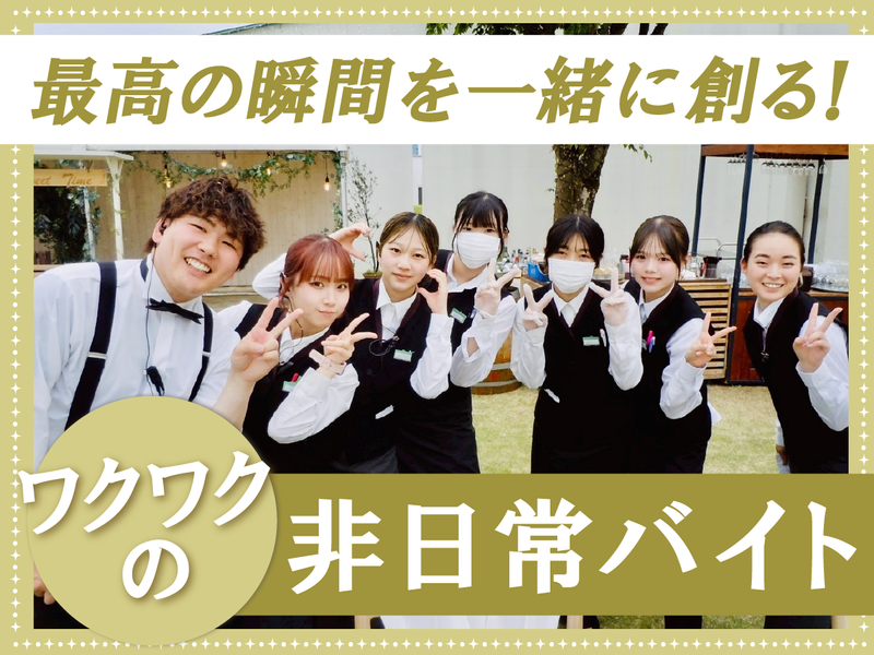 仕事内容 ”一生の思い出”をお手伝い⏳ ブライダルスタッフとして 会場準備などをお任せします! ✅急な予定も安心▷シフトは毎週提出 ✅Wワークok▷土日のみの週2日限定! ✅シンプル作業!学生さんも活躍中✨ ⌒*⌒*⌒*⌒*⌒*⌒*⌒*⌒*⌒*⌒*⌒ ▽お仕事内容 ☘ コース料理の配膳 ☘ 会場のセッティング …テーブルのクロス用意や食器の準備等 ☘ 荷物管理(クローク) …簡単なお荷物のお預かり ☘ ゲストの誘導・ご案内 …など チームに分かれての業務になります。 希望や適性を考慮して配属。 幅広いスキルが身につきますよ♪ ⭐勤務先:ヴィラ・エステリオ ⌒*⌒*⌒*⌒*⌒*⌒*⌒*⌒*⌒*⌒*⌒ ╭━━━━━━━━━━╮ ✤ 先輩スタッフの声 ✤ ╰━v━━━━━━━━╯ ⏩サービススタッフ/Aさん  ̄ ̄ ̄ ̄ ̄ ̄ ̄ ̄ ̄ ̄ ̄ ̄ ̄ ̄ ̄ ̄ ゲストに料理やドリンクを配膳。 テーブルごとに担当が決まっているため、 あっちもこっちも…とはなりません! もちろん慣れてきたら会場全体への 気配りができるようになりますが、 最初は焦らず対応が可能ですよ◎