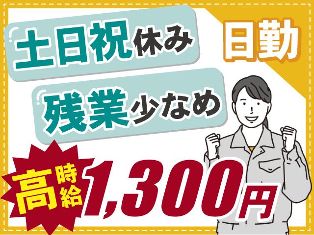 仕事内容 教育制度バッチリ!未経験スタートOK! 丁寧な指導で初心者さんでも安心して覚えていけます 20代~50代の女性スタッフ活躍中! \Point!!/ ◎残業少なめ!プライベートと両立可能! ◎土日祝休みで週末はしっかり休める ◎高時給1,300円スタート! <化学薬品の検査補助> 製造工場内でつくられた薬品の検査をお任せします。 検査は専用の機器を使用して行いますが、使い方等丁寧に指導致します。 時間をかけて教育するので、仕事が覚えられるかなどの不安はいりません。 多少の分析関連の経験者は優遇いたします! <こんな方におすすめ> ・コツコツ・もくもく進める作業が好き ・未経験から“検査・品質管理系”の仕事に挑戦したい ・手順通りに進める作業が得意 ・家庭やプライベートと両立して働きたい ・機器を使った検査や分析に興味がある ・ブランクがあっても始めやすい仕事を探している 検査や分析に興味があれば経験は問いません。 まずはお気軽にご応募ください!