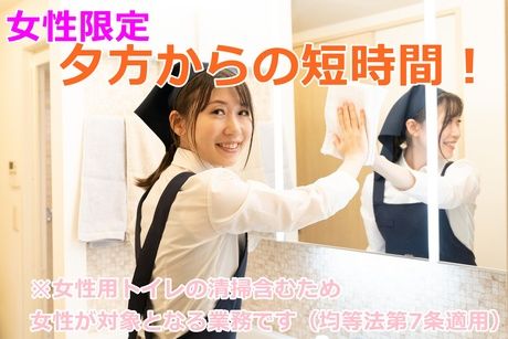 資格 ・未経験歓迎 ・女性限定 ※女性用トイレの清掃を含むため、女性が対象となる業務です(均等法第7条適用) ・年齢不問 ・主婦(夫)さん・フリーターさん歓迎 ・ブランクOK 《歓迎します》 *キレイ好きな方 *お掃除が得意な方 *もくもく作業が好きな方