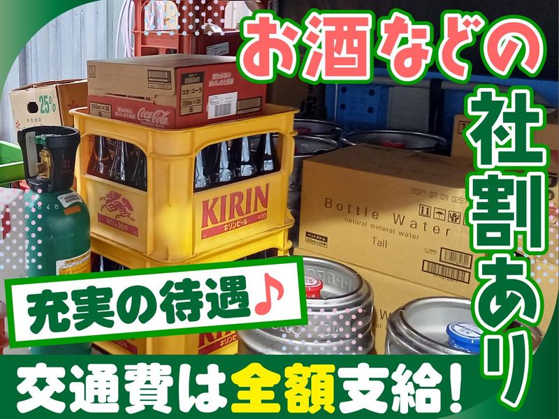 【保険制度】 雇用保険、労災保険、健康保険、厚生年金 待遇・福利厚生 【福利厚生】 ◆お酒や飲料水の従業員割引あり