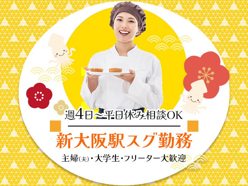 アピールポイント: ✾大阪からも京都からも!ラクラク通勤✾新大阪駅スグ勤務!! ✾しっかり長~く収入安定✾時給1450円~+交通費全額支給!! ✾週4日~平日休み相談OK✾朝ゆっくりな午前11時スタート!! ✾販売未経験者OK!主婦(夫)活躍中✾接客マナーも身に付く!! ✾フリーター・大学生大歓迎✾人気のお菓子をサクッとご案内!! <コ:彡。。。。。..........。。。。。<コ:彡