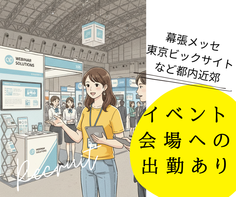 求めている人材 ■イベントや「非日常」を楽しめる方 ■短期集中で一つの仕事に打ち込み、切り替えて次の仕事に取り組むのが得意な方。 ■人とのコミュニケーションを楽しめる方 ■クライアント、協力会社、同僚など、様々な人と関わりながら仕事を進めるのが好きな方。 ■主体的に行動できる方 ■「なにをいつやるか」は自分で決める裁量権の大きい仕事です。 自分でスケジュールを管理し、責任を持って業務を遂行できる方を求めています。 他、こんな方も大歓迎! ◆人と話すのが好きで、積極的なコミュニケーションが取れる方 ◆相手のニーズを素早く察知できる方 ◆フットワークが軽く、行動力のある方 ◆前向きで、挑戦を楽しむことができる方 ◆ IT業界や新しい技術に興味がある方 ◆よりよいマジセミを目指して一緒に進化を求め続けてくれる方 ◆当社の理念に賛同していただける方 ◆IT業界経験者の方歓迎 ◆ITリテラシーの高い方歓迎 ◆業界未経験者歓迎 ◆ブランク歓迎 ◆無資格歓迎 \先輩社員からのメッセージ(展示会担当/Sさん)/ 「私はこの会社で、8年間働いています。 昔はアナウンサーとして働いていましたが、結婚を機に一度仕事から離れ、この仕事を選びました。 この会社は、社員の『こうしたい』という声に耳を傾けてくれる場所です。 展示会を成功させるには、クライアントや協力会社の方々との連携が不可欠。 たくさんの人と協力しながら、一つの目標に向かって動くこの仕事に、大きなやりがいを感じています。 『とにかく色々な状況を楽しめる方』『人との出会いを大切にできる方』と一緒に働きたいです!」 < 当社のミッション・バリューに共感してくれる方へ > 私たちは、ただのウェビナー提供会社ではありません。 「世の中の全ての課題をウェビナーで解決する」という壮大なミッションを掲げ、 面白くないウェビナーをなくし、エンタメに変えることを目指しています。 私たちは以下の7つのバリューを大切にしています。 ●自ら考え仕事を創る ●挑戦を楽しむ ●仕事に誇りと喜びを感じる ●仕事を通して自分が成長できる ●安心して安全に自由に発言し議論する ●お互い100%敬意を持って接する ●遊ぶように働く 当社のミッション、ビジョン、バリューに共感し、 一緒にマジセミを創ってくれる方からのご応募をお待ちしております!