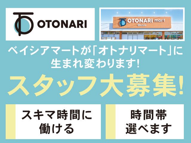 仕事内容 <オープンしたばかり!スーパーの店舗スタッフ/短時間OK> 日光市のスーパーマーケット ベイシアマート今市店が 「オトナリマート」に生まれ変わりました! 「ひとりの食事シーンを楽しくする」を コンセプトに、こだわりの商品を手頃な価格で 提供することを目指すお店です! おひとりさまも、もちろん家族みんなでも 楽しんでいただけるお店作りを 一緒にしていきませんか! ============== オトナリマート今市店 新規スタッフ募集! 働き方、イロイロ! 新しくキレイになった店舗で 一緒にスタートしませんか! ============== \ おすすめポイント!/ ・リニューアルオープンしたばかり! ・新しい店舗形態へ生まれ変わりました ・品揃えも一新されて楽しさUP! ・週4日、1日4時間の短時間 ・お子様が保育園や学校の間になど スキマ時間にお仕事OK ・家事や育児との両立も可能 ・曜日や時間帯で時給UP ・主婦(夫)パートさん活躍中 ・未経験OK ・ブランクOK 《募集職種》 パート/惣菜スタッフ <主なお仕事内容> 商品陳列・補充、弁当や 揚げ物の調理・パック詰め など ※レシピ・マニュアルに沿って 進めるお仕事です。 <未経験からのスタートが多数> スーパーのお仕事未経験の方や 業務が不安な方もご安心ください! 先輩スタッフがサポートしてくれるので 何か困ったことがあればいつでも相談できます。 <スキマ時間にお仕事可能!> ベイシアには 午前中メイン、日勤、昼・夕方のみ等、 短時間~しっかり稼げるフルタイムまで 働き方がいろいろあるから ライフスタイルに合わせた 時間帯や勤務日が選びやすい! 短時間OKなのでご家庭との両立も可能! \ベイシアで働く方の口コミ/ ・ベイシアの商品は安いのに高品質。 Low costな食品や日用品をお仕事終わりに 買い物して帰ることができるので、 すごく便利です! ・急な家庭の用事や子供の体調不良で 休む時も理解のある会社なので、 主婦(夫)でも働きやすいです!