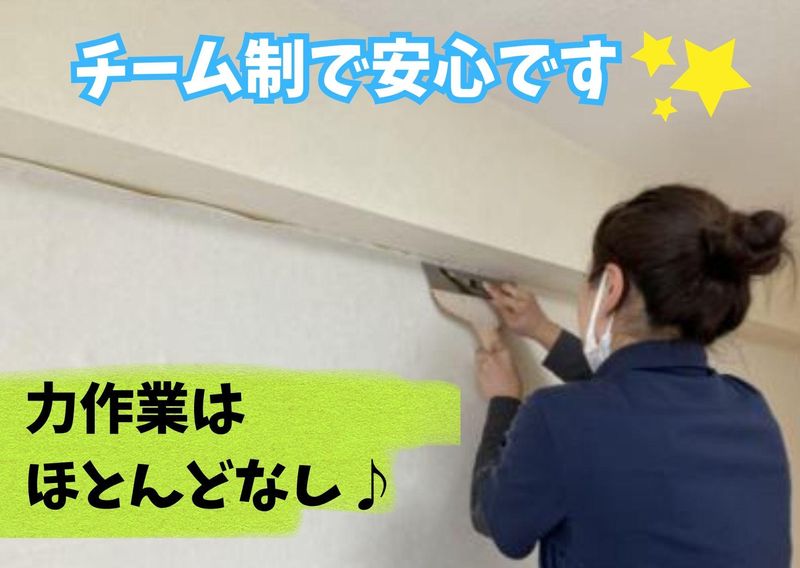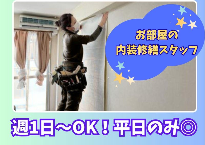 仕事内容 ✅未経験OK!力仕事ほとんどナシ◎ ✅平日のみ週1日~OK! ✅土日祝休みでプライベートも充実! ✅早上がりでも日給保障! ✅10~60代まで幅広く活躍中! 【仕事内容】 老人ホーム等の施設で清掃、壁紙や床の張替え・塗装など、退去した部屋をキレイにするお仕事です。 基本は1日1件の対応で、作業が早く終わった時も日給保障あり♪ (※アパート6畳程度の部屋をチーム体制で作業します) 楽しみながらもやりがい十分なお仕事✨ 1日1部屋をみんなで作業して完了させるので、綺麗になった現場を見たら達成感をひときわ強く感じられます◎ 未経験でも丁寧に教えるので安心して始められますよ! ⏰ 1日のスケジュール(例)⏰ 7:50 出社 準備 8:00 朝礼 移動(運転しなければ休憩となる) 9:30 施設入館 作業 12:00 昼食休憩 13:00 作業再開 16:00 作業完了 退館 移動(運転しなければ休憩となる) 17:00 退社 おつかれさまでした✨ \\ ⭐ここがオススメ⭐ // お仕事は平日のみなので、土日祝はゆっくりお休みが取れます! Wワークで掛け持ちしながら働くスタッフも在籍中! 未経験から始められるので、スグに収入UPが目指せます! 「週1日でサクッと勤務」「週5日ガッツリ勤務」どちらも大歓迎! 本業の都合で土日勤務をご希望の方もお気軽にご相談ください♪ モクモク作業やものづくり・DIYが好きな方にもオススメです!
