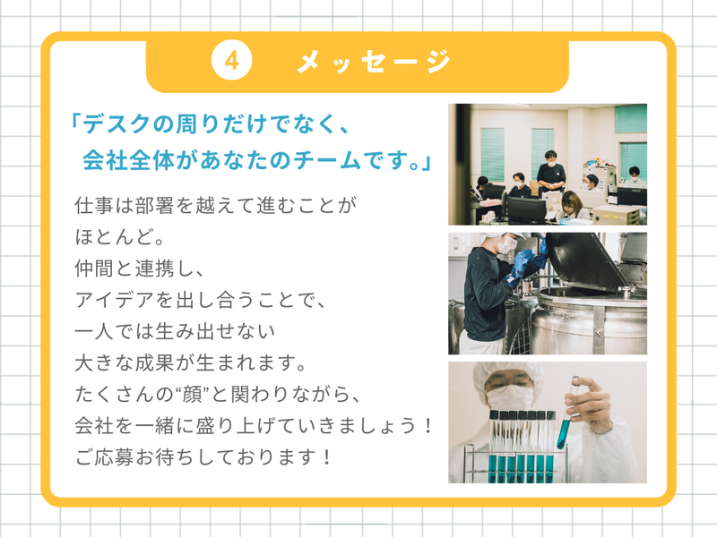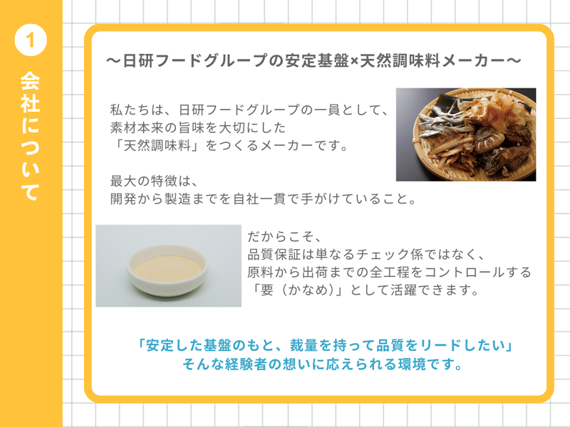 求めている人材 ⭐20代・30代活躍中/人柄重視の採用です⭐ 〈必須条件〉 ・高卒以上 ・食品業界での品質管理・保証の 実務経験をお持ちの方(目安:3年以上) 〈こんな方も大歓迎です!〉 ・FSSC22000 / ISO22000 などの 認証運用・審査対応の実務経験 ・「言われたこと」より「自分で考えること」が好きな方 ・安定した企業で腰を据えて働きたい方 ・しっかり稼いで、しっかり休みたい方 ・地元・愛知で転勤なく働きたい方 ・現場の人とコミュニケーションを取るのが好きな方 ・新しい知識や資格取得に前向きな方 ――あなたの経験を、もっと価値あるものにしませんか? 「自分ができる仕事の領域を広げたい」 「多品種の製品を扱い、知識を広げたい」 「裁量ある環境でスキルを伸ばしたい」 「自分の意見が反映される環境で働きたい」 そんなあなたに、ぜひご応募いただきたいと思っています! ✅ 17名だからこそ、あなたが主役です。 当社は全社員17名というコンパクトな組織ですが、 その分 “あなたの経験が会社の品質レベルを左右する” ほど重要な存在になります! ★食品の“おいしさ”を生み出す喜び ★自分の判断で“安全”を守る責任と誇り ★スーパーで自分が関わった商品を見つける達成感 こうしたやりがいを感じながら、私たちと一緒に働きませんか? ■ 経験者のための Q&A 「次の転職で絶対に妥協したくないポイント」を解決! ┈┈┈┈┈┈┈┈┈┈┈┈┈┈┈┈┈┈┈┈┈┈┈┈┈┈•• Q: 現職では、品質保証の裁量が小さくてストレス。 工程改善やFSSC運用にも関わりたい。 A:当社は “仕組みづくりの中心” を担えます。 品質保証は単なるチェック部署ではなく、 FSSC22000の運用・更新、 工程改善、基準づくりなど 品質保証部門が主導して進める文化があります。 製造・開発との距離が近いため、 「改善したい」と思ったことを、 その日のうちに現場と検証し、 翌週には仕組みに反映… といったスピード感で動けます。 「裁量の広さ」や「横串で関わる実感」を求める方に最適です。 ────────── Q:品質保証としては成長したいが、 管理業務ばかりで “プレイヤーとしてのスキル磨き”ができない。 A: 検査・分析から監査対応まで 一気通貫で関われます。 理化学・微生物検査、規格書、 取引先監査、工程設計、 クレーム対応、表示確認、FSSC運用まで、 品質保証のフルセットに携われるのが当社の特長。 部門が細分化されすぎていないため、 “業務の一部分だけ” “同じ書類作成ばかり” といった状態にはなりません。 経験者がさらに専門性を高められる環境です。 ────────── Q: 会社によって品質レベルが低く、 現場が動いてくれず改善が進まないのが悩み…。 A: 全社で「品質最優先」を徹底しています。 当社は“天然調味料”という性質上、品質が命。 そのため、品質保証の意見が最優先。 ・製造部との定例会議 ・衛生管理の現場ラウンド ・設備更新の提案 ・工程改善の立案 など、 品質保証の提案が組織全体に通りやすい文化があります。 品質保証の権限が弱い環境に疲れている方には 大きな魅力になります。 ────────── Q: 残業過多・休日が少なく、 働き方が改善されない会社はもう嫌…。 A: 17時定時・土日祝休み・残業月20h以下です。 品質保証はどうしても突発対応が発生しがちですが、 当社は工場全体で “日勤のみ・定時帰り” を徹底。 ・改善活動は計画的 ・トラブル発生時はチームで対応 ・工程設計が安定しているので夜間対応なし 食品メーカーでは珍しいほど、 無理のない働き方が叶います。 ────────── Q:待遇が頭打ち。 経験を積んでも評価につながらない…。 A: 少数精鋭×高収益企業だから、 還元力が桁違いです!✨ 従業員17名で 売上7億円という生産性の高さが強みで、 昨年度の賞与は 5.3ヶ月分。 「経験者が入ればすぐ活躍できる」 「会社の利益に直結する」 という構造だからこそ、 利益を社員にしっかり還元する風土があります◎ 食品業界で“待遇も諦めたくない”方に 選ばれています! ────────── Q: 品質保証としての経験はあるが、 転職直後に何から担当するか不安。 A: 入社初月から“経験者前提”で重要業務をお任せします。 …とはいえ丸投げではなく、 まずは現状のFSSC運用・工程・検査体系を把握いただき、 2~3ヶ月目からは改善提案・工程管理にも参加。 「経験者がキャッチアップしやすい設計」 「必要な情報は開示」 「現場や製造との連携もすぐ取れる距離感」 など、即戦力として“動きやすい土台”がありますので ご安心くださいね。