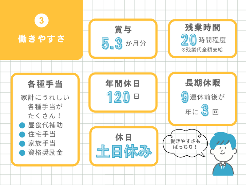 職場環境 \⭐「安定」も「収入」も諦めない!⭐/ 創業50年超の安定企業で、 納得の厚待遇をご用意しています✨ ✅ 賞与5.3ヶ月(昨年度実績) ✅ 年間休日120日(土日休み) ✅ 住宅手当・家族手当あり ✅ 転勤なしでライフプランも安心◎