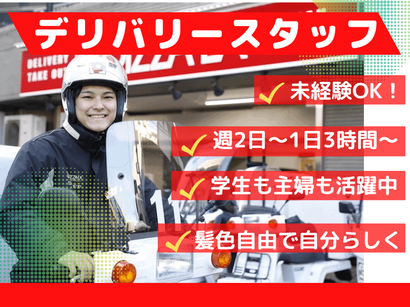求めている人材 原付免許もしくは普通自動車免許をお持ちの方(原付バイクの運転したことない人もOK) 【未経験OK!友達との応募も大歓迎】 高校生もOK 大学生やフリーターさん・主婦パートさんも活躍中! 初めてバイトも、初めてデリバリーの方も多く活躍中なので、ご安心を☆ 【こんな方におススメ】 ・学業と両立しながら働きたい ・週2日スキマ時間を活用して副業 ・週5勤務で安定して働きたい ・おしゃれを楽しみながら働きたい ・ピザが好き(従業員割引で半額に!) ・一人の時間も割と好きだ ・外出が好き