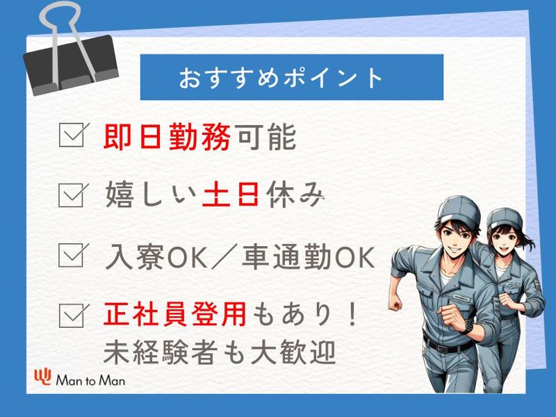 求める人材: 【応募資格】 資格・経験不問 ブランクOK 特別な知識やスキルは一切不要! ================= ~このような方が働いています~ ・とにかく稼ぎたい方 ・異職種から転職された方 ・製造業が未経験の方 ・男性活躍中の職場で働きたい方 ・20代、30代活躍中の職場で働きたい方 ・年間休日120日以上の職場で働きたい方 ・寮に住み込みで働きたい方 ・プライベートを充実させたい方 ・正社員を目指している方 ・経験を活かしたい方 ================= その他にも、Man to Manには、 ハローワークや一般求人誌には 掲載されていないお仕事情報も たくさんありますので、 まずはお気軽にお問合せください。