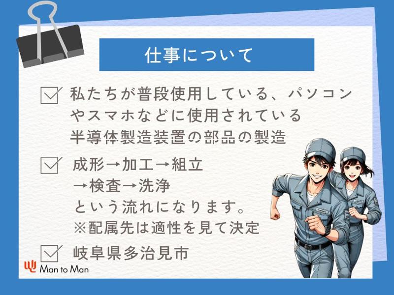 仕事内容: 【職種】 電子器具の製造 【仕事内容】 【 給与例 】 (時給1,740円×8h×21日)+深夜手当+ 残業手当+休日出勤1日=381,495円 【 ここがポイント 】 ・未経験OK/ブランクOK ・即日勤務可能 ・入寮OK/車通勤OK ・空調完備 ・福利厚生充実 ・軽作業 ・高時給&高収入 【 仕事内容 】 私たちが普段使用している、パソコンや スマホなどに使用されている半導体製造装置 の部品の製造を行います。 成形→加工→組立→検査→洗浄という流れに なります。 ※配属先は適性を見て決定します。  ̄ ̄ ̄ ̄ ̄ ̄ ̄ ̄ ̄ ̄ ̄ ̄ ̄ ̄ ̄ ̄ ■□■ 成形 ■□■ 製品の原形を作る作業。 クリーンルーム内で原料の仕分け・調合し、 プレス機を操作します。 ■□■ 加工 ■□■ 焼成後の製品のバリを削ったり、 製品に穴を空けたりする作業。 ■□■ 組立 ■□■ 加工した製品に電子部品(端子)を 組み付けていく作業。 図面を見ながら端子を取り付けていく。 ★細かい作業が得意な方にはおススメ! ■□■ 検査/洗浄 ■□■ 製品の外観や性能を検査する作業。 外観の目視検査や、検査機械を使用した 検査があります。 ※全て覚えるのではなく、配属された 部署の作業を覚えていただければ大丈夫! ご不明点等、いつでもお気軽に お問合せ下さい。 沢山のご応募、お待ちしております。