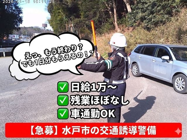 仕事内容 \あなたの警備員デビューを応援します!/ ★未経験歓迎・シニア活躍中★ 水戸・ひたちなか・那珂をはじめ 茨城県央エリアに勤務地多数。 笠間方面へもエリア拡大中のため積極採用しています。 当社採用率は95%以上! 未経験者・経験者・資格保持者すべて歓迎。 定年退職後のお仕事をお探しの方、 警備に興味のある若い方も必見です。 長く働けるアットホームな職場です。 入社日もご相談に応じます。 <ここがポイント> ・未経験・無資格OK(法定研修あり) ・日勤のみOK/生活リズム安定 ・日給10,000円~13,000円 ・シフト相談OK/希望休も柔軟対応 ・昇給・各種手当あり ・シニア活躍中/年齢不問 ・正社員登用実績あり ■仕事内容 工事現場・建設現場での**交通誘導・安全サポート(警備業務)**を担当します。 具体的には ・歩行者・車両の誘導、安全確保 ・工事車両の出入り時の確認 ・現場周辺での簡単なご案内 ※力仕事はほぼなし ※ルールに沿って進めるシンプル業務 ■未経験でも安心の理由 ・入社後に法定研修20時間あり ・交通量の少ない現場からスタート ・先輩がマンツーマンでフォロー ・困った時はすぐ相談できる体制 「できることから少しずつ」でOKです。 ■こんな方に向いています ・未経験から警備の仕事を始めたい ・地元(水戸・笠間・ひたちなか)で働きたい ・定年後も働ける仕事を探している ・警備経験・資格を活かしたい ・安定収入を得たい ※学歴・職歴・転職回数不問 ※18歳以上(警備業法) ■採用担当より 「警備の仕事は初めてで不安…」 「自分にもできるか心配…」 そんな方も大歓迎です。 未経験から始めたスタッフが多数活躍しています。 まずは 「話だけ聞いてみたい」 「条件を確認したい」 だけでもOK。 お気軽にご応募ください。 【休日・休暇】 ・週休二日制 ・夏季、冬季休暇 ・介護休業取得実績あり ・年次有給休暇あり ※急なお休みにも対応しています。 【福利厚生・待遇】 ・社会保険完備 ・昇給制度あり ・資格取得支援制度あり ・車、バイク通勤可 ・マイカー通勤可 ・無料駐車場あり ・受動喫煙対策あり(屋内禁煙)