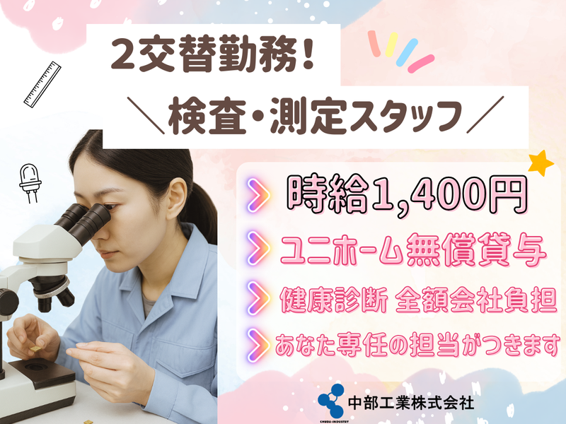 仕事内容 ――――働きやすいPOINT――― ・未経験歓迎!事前に入社前研修あり!(きちんと時給で支給!!) ・まずは職場見学から!でOK★ ・入社後の職場変更OK!1人1人に合ったお仕事用意します! ・専任の担当がつきます!困った時など相談しやすい ・入社まで最短1週間!入社希望日ご相談ください ・エアコン完備で職場環境◎マニュアルもあって簡単! ・応募、面接は自由!電話応募でもWEBでもOK!面接場所も相談OK ー ◆空調完備で快適◎ ◆職場もきれい! ◆20代、30代、40代みんな活躍中! 【お仕事内容の詳細】 ・検査 顕微鏡をのぞき、傷や汚れがないかをチェック! ・測定 定規を使って、規定内のサイズなのか等を測る! ――――中部工業(株)とはー ・派遣先は見学させて頂き、安全に働けるか確認してます! ・長期で働いて頂けるためにフォロー体制はバッチリ! ・学びと成長を応援!資格が必要な職場では資格取得制度あり◎ ・多様な働き方へも柔軟に対応! ・正社員になりたい等もバックアップ! ・様々な職種に対応したe-ラーニングによる研修あり ・何よりも充実した待遇! https://chubukogyo.jp/ 入社前に安心して仕事ができる様に致します "お気軽にお問い合わせ、ご相談ください ” 現場見学もできます。 <経験・興味がある方歓迎→自動車部品/工業/工場作業/倉庫/倉庫作業/機械オペレーター作業/仕分け/ピッキング/製造/検品> - 「応募画面へ進む」よりネット応募いただけます。 お電話でのご応募も大歓迎! TEL:059-370-3418 ●面接場所はご相談させて頂きます。 ●お電話の受付/平日9:00~17:00 土日は定休日の為、平日に折り返しさせていただきます。 ●ネット応募からは24時間受付中
