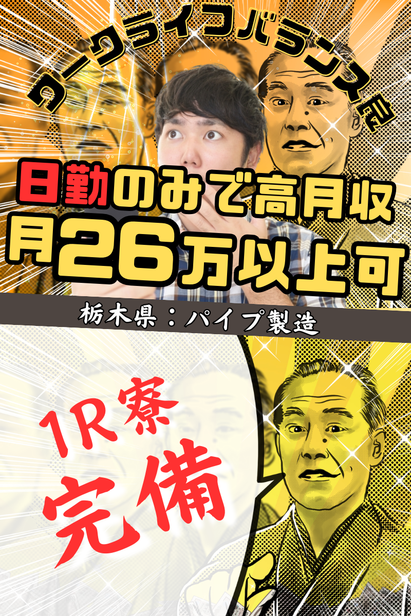 仕事内容 【 応募から2週間程度で内定可能! 】 《 ここがポイント! 》 ●月収26万円以上の高収入が可能 ●土日休み+夕方終業で私生活充実 ●1人でモクモクより、2人作業が得意な方に◎ 《 仕事内容 》 プラスチック製の住宅用パイプを 製造している工場でのお仕事です! 扱うのは直径約15cm・長さ1mの 小型パイプから、直径20〜30cm・ 長さ4〜5mの大型パイプまで さまざまです。 <組立作業> 作業台で接着剤を使い、 パイプ同士をつなぎ合わせます。 機械で接合の確認後、 箱詰めまで行います。 <梱包作業> 2人1組で対応し、結束機を使って パイプ両端をビニール袋で封じます。 <機械作業> パイプを機械にかけ、指定された 長さにカットしていく作業です。 《 自分の時間も大切にできる! 》 夕方までのお仕事で、 月26万円以上の収入も可能! 日勤固定で生活リズムも安定。 勤務時間は8:00~16:30と 毎日決まっているので、 交替制のような変動がなく 安心して働けます。 土日休みで予定も立てやすく、 趣味や家族との時間も充実! プライベートを大切にしたい方に ぴったりの環境です。 《 働きやすさに配慮された職場 》 無理なく作業に集中できるような 環境が整っており、 長く続けやすい職場です。 落ち着いた空間で、 業務にしっかり取り組めます。 《 20~40代のスタッフが中心! 》 現在は20代・30代・40代の スタッフが中心に活躍中! 未経験スタートの方も多く、 丁寧なサポート体制があるので 安心して始められます。