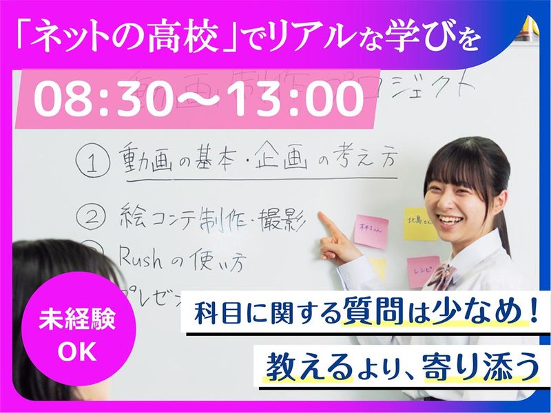 仕事内容 ★━━━━━━━━━━━━…‥・ ꒰꒰ ✨仕事のポイント✨ ꒱꒱ ❏服装・髪型は自由 (※社内規定あり) ❏扶養内勤務OK! 家事と両立する主婦・主夫さん活躍 ❏女性スタッフ活躍中 ❏シフト融通◎家庭と両立可! ❏サービス残業なし ❏資格・経験不要!未経験スタート100% ・・・‥…━━━━━━━━━━━━★ ⏩仕事内容  ̄ ̄ ̄ ̄ ̄ ̄ 角川ドワンゴ学園が運営する 「N高グループ」の通学コースにて、 高校生たちのキャンパス生活や 授業をサポートするお仕事です。 ⏩具体的には...  ̄ ̄ ̄ ̄ ̄ ̄ ̄ ̄ ̄ ☑授業内グループワークのファシリテート ┗アイデアが出しやすいよう ヒントを出したり進行をサポート ☑生徒の進路や悩み相談への対応 ┗雑談やちょっとした会話から 信頼関係をつくるのも大切◎ ☑イベントや授業の企画・提案 ┗あなたの得意や興味が授業になるかも! ☑キャンパス運営に関する会議参加 ┗「こうしたらもっとよくなるかも!」 という意見も大歓迎! ✨2025年4月OPENなので、 今のご入社ならまだ2期生! 立ち上げ期を一緒に走れるのは今だけ! ✦・┈┈┈┈┈ ・✦✦・┈┈┈┈┈ ・✦ ⭐ やりがいポイント  ̄ ̄ ̄ ̄ ̄ ̄ ̄ ̄ ̄ ̄ ̄ 生徒との1対1の面談や会話の中で、 「ちょっと元気が出た」「話せてよかった」 と言ってもらえる瞬間が、一番のやりがい! 最初は緊張していた生徒が、 自分のことを話してくれるようになると 「信頼関係ができた」と実感できます◎ ⭐最初はつまずきやすいかも・・・?  ̄ ̄ ̄ ̄ ̄ ̄ ̄ ̄ ̄ ̄ ̄ ̄ ̄ ̄ ̄ ̄ ̄ ⏺自分から知らない生徒に話しかける 場面がある ⏺あまり話したがらない生徒との会話に 悩むことも ⏺わからないことが出てきた時に 自分でマニュアルを見たり、 周りに質問する力が求められる はじめはこんなところで戸惑う人も。 ⏩でも、大丈夫! 先輩TAや職員さんがすぐに 相談に乗ってくれるので安心! ✨冬休みなど帰省のタイミング相談OK✨  ̄ ̄ ̄ ̄ ̄ ̄ ̄ ̄ ̄ ̄ ̄ ̄ ̄ ̄ ̄ ̄ ̄ ̄ ̄ ̄ GWや冬休み、年末年始などの期間中は 学校もお休み!その期間中にお子さんの 行事や実家への帰省、海外旅行などの 予定があればお気軽にご相談ください♪ また、休み期間中のWワークも可能です。 ========================= 【実際に勤務するTAの声】 ✨入社3年目/社会人女性 ◎おすすめポイント 相談しやすい環境で、 分からないことがあっても すぐに聞けるところがいいです! 一人で黙々と…じゃなくて、 みんなで協力するチームワーク 重視の環境も気にいっています。 ▲向いていないかも? 生徒とのコミュニケーションが苦手だったり 受け身な姿勢だと少し大変かもしれません。 わからないことをそのままにせず、 自分から質問したり、 主体的に動けることが大切です。 =========================