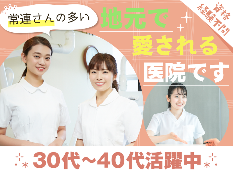 仕事内容 \地域に愛される歯科医院でのお仕事/ ✅未経験OK!最初は簡単な業務から◎ ✅週1日~勤務OK!時間応相談 ✅20代~50代スタッフ活躍中! ✅地元の常連さん多数で温かい雰囲気 *・*・*・*・*・*・*・*・* 地域に親しまれている歯科医院で、 歯科助手業務をお任せします。 【具体的には…】 ■診療補助 ■受付業務 ■診療の準備、片付け など 特別な資格や経験は不要! はじめは簡単な作業から 丁寧にお教えするので、 未経験の方も安心してスタートできます。 分からないことは先輩スタッフが しっかりフォローしますよ◎ ⭐来院される患者様について  ̄ ̄ ̄ ̄ ̄ ̄ ̄ ̄ ̄ ̄ ̄ ̄ ̄ ̄ お子様から中高年・シニアまで、 地域の常連患者様が中心の歯科医院です。 顔なじみの患者様も多く、 落ち着いた雰囲気の中で働けます。 ⭐こんな対応が喜ばれます  ̄ ̄ ̄ ̄ ̄ ̄ ̄ ̄ ̄ ̄ ̄ ̄ ̄ ̄ ちょっとしたお喋りや 明るい声かけなど、 患者様に寄り添った対応が とても喜ばれる職場です。 元気で明るい対応ができる方、 人と接することが好きな方を歓迎します! *・*・*・*・*・*・*・*・*