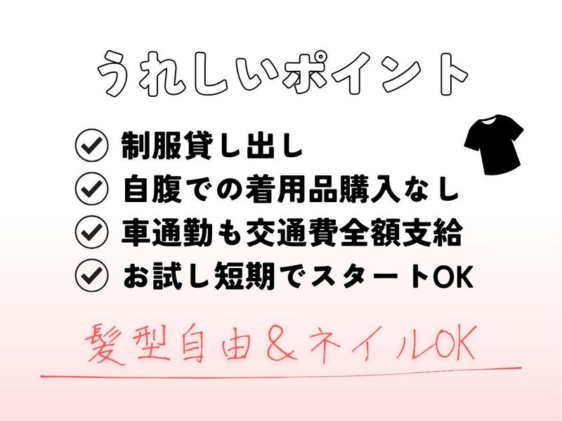 求めている人材 ◎髪型自由・髪色自由 ◎ネイルピアスOK ◎社員登用あり ◎アットホームな職場 ◎個人ノルマなし 必須:笑顔で挨拶できる方 歓迎:やってみたい気持ちのある方 ▽募集背景 ベテランスタッフさん退職に伴い増員することにしました。 ▽服装について 制服貸し出しありの店舗です。 出費や社販いらずがうれしい♪ ――⭐やりたい気持ちがあれば歓迎! ◎学生活躍中 ◎主婦主夫活躍中 ◎フリーター歓迎 ◎経験者歓迎 ◎未経験歓迎 ◎ブランクOK
