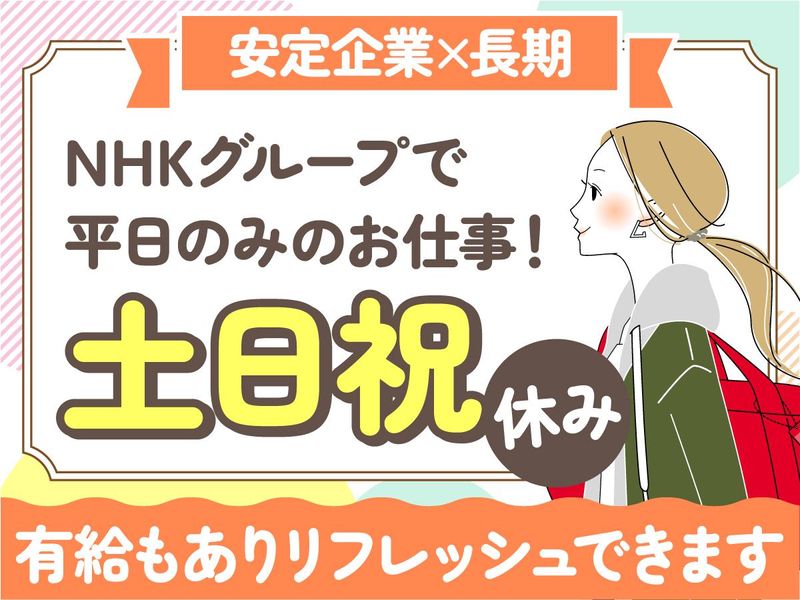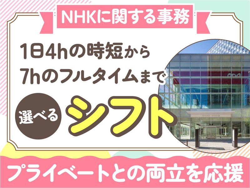 仕事内容 【ポイント】 *短時間~フルタイムまで3シフトあり! *週5日・1日7h勤務で時給1210円! *土日祝休みでプライベートも充実! *オフィスは勾当台公園駅チカ! *食堂や飲食可能な休憩スペースもあり! 【仕事内容】 NHK放送受信料に関する事務のお仕事。契約書類のチェックやPCでのデータ入力、専用ソフトを使った不備・重複の確認などを担当します。 <具体的には> *お客様の契約書類のチェック *PCでのデータ入力 *専用ソフトによるお客様データの不備や重複の有無の確認 *必要に応じてお客様への電話確認 <採用後の研修について> 充実した研修とマニュアルを用意しており、未経験の方も安心してスタートできます。研修後も分からないことはマンツーマンでサポートします。 <採用予定日> 2026年2月10日(火) ==================== 【ライフスタイルに合わせて働けます】 「フルタイムでしっかり稼ぎたい」「日中に短時間で働きたい」「お子さんの送り迎えの時間まで働きたい」など、ライフスタイルに合ったシフトを選択して無理なく働けます。家事や育児、趣味といったプライベートとの両立ができるよう、シフトや働き方の相談が可能です! 【NHKグループならではの待遇】 土日祝休み・有給休暇・社会保険完備など、安定して長く活躍できる福利厚生が整っています。またオフィスには食堂や休憩スペースがあり便利です!勤務中の服装はオフィスカジュアルでOK。オシャレも楽しめますよ。 【通勤しやすい好立地な職場】 NHK仙台放送局内の仙台事務センターまたは仙台事業所が私たちのオフィス。勾当台公園駅より徒歩3分と近く、仙台駅からも通勤できます。ランチタイムや仕事帰りの食事・買い物も楽しめる便利な立地です!