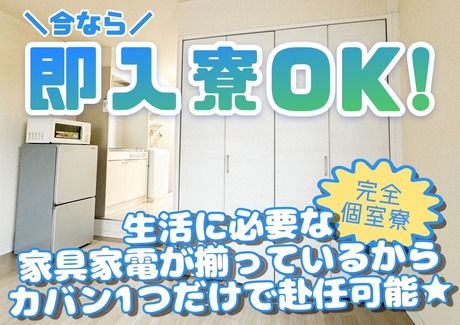 選考プロセス 【1.応募】Webまたはお電話から応募。 【2.面談予約】応募完了後、メール又はお電話を差し上げますので面談の日程を決定します。 【3.面談】面談のお時間は30分程です♪WEB面接なら自宅で気軽に受けられます♪もちろん来社面談もOK! 【4.職場見学】実際に職場を見てから決められます。面談から数日~1週間後を想定しています 【5お仕事開始】入社日は職場見学から数日~1週間程度を想定しています 面談から選考・手続きを含め、入社までは2週間程度となります。 職場によって前後しますので担当者にお問い合わせください。 ※入寮の方は寮の空き状況によってタイミングが異なります 【問合せ先について】 問合せ先:0120-021-806 応募方法 当社の求人をご覧いただきましてありがとうございます。 ご応募はWEB又はお電話で受け付けています。 WEBの場合は応募フォームを入力、送信してください。 お電話の場合はご希望のお仕事をお伝えください。
