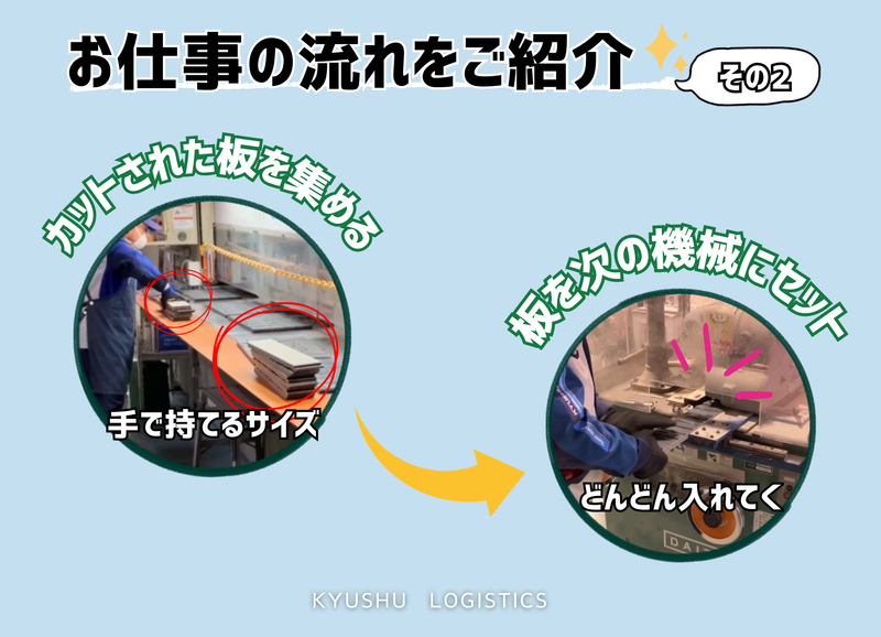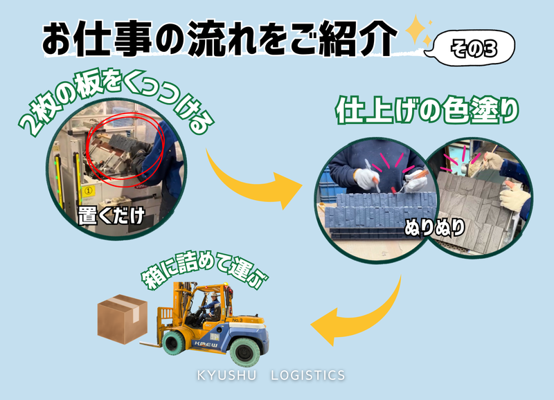 仕事内容 ============ 大手メーカー工場内勤務⭐ <土日祝休み×日勤のみ> カット、セット、ぬりぬり作業! ============ 【オープニングスタッフ募集】 住宅の外壁に使われる板(一部)を製造するお仕事です。 簡単に言うと、板を切る→貼る→塗る!の簡単作業です。 毎回全部の工程をするわけではなく、リフト運搬とどこかの工程中心にお願いします。 リフト作業は少し運ぶくらいなので免許があれば未経験OKです✨ <作業の流れ> 【①運搬】リフトで板を運ぶ 【②設備投入】薄くて長い板を台にセット 【③板回収】(機械がカットしてくれて)カットされて小さくなった板を集める 【④積載】次のカットしてくれる機械に投入(軽い!) 【➄設備投入】でてきた板2枚に接着剤を付けて、形が▲になる機械に置く(いいかんじにくっつけてくれる) 【⑥仕上げ】付け根をコロコロで色を塗ったり、筆で色を塗ったりして仕上げる(コロコロ、ぬりぬり作業) 【⑦検査・梱包】最後にチェックして、段ボールに詰める 【⑧運搬】リフトで移動させる 男女スタッフ共に活躍していただける環境です♪ 【オープニングスタッフ(社員)募集!】 この度オープンした「足利事業所」のオープニング社員を募集します。 一緒に働く仲間は本社からの先輩とほぼ同期のスタッフが大半なので人間関係もみんなイチから。 一緒に楽しみながらがんばってくれる方お待ちしてます♪ 【未経験・ブランクOK✨】 独り立ちするまで、入社後1~3ヶ月程度は先輩が横について作業を教えてくれますので、分からないことはすぐに質問できます。 職場では、"安全運転第一"を心がけており、焦らず、確実に技術を習得できる環境を整えています。 一人デビュー後も近くに先輩はいますので、フォローが必要な時はサポートします。 【九州物流株式会社について✨】 わたしたち九州物流株式会社は、住宅建材の製造加工を主軸に、1982年の創立以来、高品質で信頼性のある製品の提供に努めております。 自社工場内で大手外壁材メーカーの純正品を加工・塗装、メーカー工場内でラインやリフト作業、構内物流などをのお仕事を請け負っています。 また、本社がある福岡県北九州市のご当地ヒーローキタキュウマンのメインスポンサーなども行っています。
