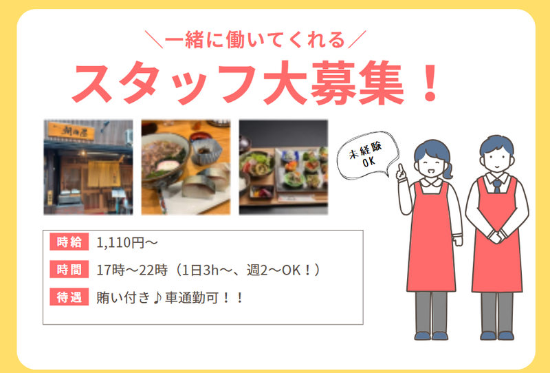 仕事内容 \創業100年以上の歴史ある和食店★/ ✨ランチ・ディナータイムに働ける方を大募集 ✨豪華まかない補助付!まかない弁当のお持ち帰り有♪ ✨JR松井山手駅から徒歩2分の駅チカ☆ ✨車通勤OK!駐車場完備&交通費支給 ◇お仕事内容◇  ̄ ̄ ̄ ̄ ̄ ̄ ̄ ・接客(タブレットオーダー利用) ・簡単な盛付け ・片付け&洗い場 ・お会計 ・配膳 をお願いします♪ 調理は社員が担当しますので 難しい作業はありませんよ♪ 難しい知識などは必要なし! 1つ1つ丁寧に教えるので未経験・ バイトデビューの方も安心して働けます♪ ◇駅チカで便利♪◇  ̄ ̄ ̄ ̄ ̄ ̄ ̄ ̄ 駅チカなので、学校終わりに バイトできるのも魅力♪ 近くにショッピングモールもあるので 勤務帰りに買い物もしやすい♪