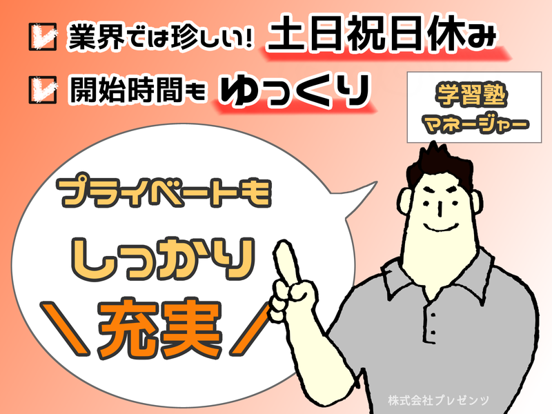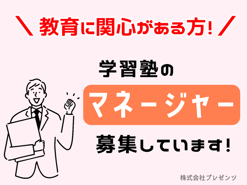 仕事内容 \タブレット学習の見守り!難しいお仕事なし✨/ 子どもの成長を見守りながら塾運営の経験もつめる☆彡 ===⭐ アピールポイント ⭐=== ✅未経験OK!資格・経験不問 ✅13時出勤で午前中は自分時間を満喫できます! ✅授業や採点は一切なし!生徒のサポートに専念✨ ✅完全週休二日制でプライベートも充実! ✅脱毛無料や塾代無料など独自の福利厚生が多数! ✅未経験から安心の1ヶ月間の丁寧な研修制度あり! ================== 【業務内容】 個別学習塾「松陰塾」にて、生徒一人ひとりの成長を支える教室運営のお仕事です。 最新のタブレット学習を導入しているため、 講義や採点といった教える業務は一切ありません。 未経験の方でも、子どもたちの見守りや教室環境の整備からスタートできる環境です。 ▼ 具体的なお仕事 ▼ ・生徒一人ひとりの学習進捗の把握とフォロー ・保護者様への連絡や面談、相談対応 ・アルバイトスタッフのシフト調整や管理 ・教室内の清掃や整理整頓などの空間づくり ・季節ごとの講習準備や入塾希望者への案 <入社後の流れ> 入社後はまず教室運営の基礎を習得していただきます。 数年後には、複数の教室を統括するマネジャー候補としての活躍や、 多角展開する他事業の運営に携わるチャンスもあります。 対人スキルやマネジメント能力を磨きながら、 将来的には会社の中心メンバーとして、 組織の拡大や部下育成を担うポジションを目指すことが可能です。 ▼経験ゼロでもこれで安心▼ 〇最初の約1ヶ月間はオンライン教材で 教育システムをじっくり学べる期間を設けています。 〇先輩社員がマンツーマンで、 生徒への接し方や塾運営のコツを一つずつ丁寧に伝授します。 〇システム化されたタブレット学習を導入しているため、 特別な学力や教える技術は不要です。 ▼当社で働く魅力▼ 〇運営は1人! 基本、1人での業務となる予定です。 ご自身のペースでお仕事を進めていただけます^^ 〇授業なし! タブレット学習塾のため、授業や採点はありません。 子どもたちが解けない問題があったときにフォローと手助けをお願いします! 〇福利厚生が充実! ご自身のお子さんの通塾やサロン利用など、プレゼンツの系列店が利用可能です♬ 自分にも家族にもうれしいポイントです☆ ▼株式会社プレゼンツについて▼ 「ありがとうが溢れる社会を創造する」ため、様々な分野での活動にチャレンジし続けている会社です♬ 教育事業部では、未来ある子どもたちに「自ら学ぶ」「自ら行動する」を身に着けてもらい、人生を豊かにするお手伝いをしています。 他には… ◆リユース事業 ◆EC事業部 ◆サロン事業部 なども展開中☆ ぜひ、 一緒に子どもたちの、また私たち自身の笑顔を創造していきましょう!