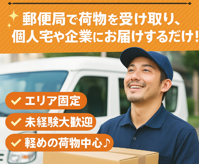 仕事内容 \\ ✨この求人のポイント✨ // ✅ 未経験からでも安定収入!3ヶ月間の最低 日給保証あり✨ 月収30〜70万円を目指せます。業務開始 後3ヶ月間は、日給12,000円の最低保証! 頑張りはしっかり収入に反映◎ ✅ 地域密着で安心 引っ越しや転勤の心配なく、家族や生活 スタイルを大切にできます✨ ✅ エリアは決まっているから安心 担当エリアは固定。道を覚えてしまえば、 配達もスイスイ進められます。 ✅ 荷物は軽いものが中心 体への負担が少ないので、男女ともに長 く続けやすい仕事です。 ✅ 休憩は自分のタイミングでOK 配達の合間に好きな時間で休憩。無理な く、自分のペースで働けます。 ✅基本は一人でコツコツ配達 → 接客は最低限だから、人と話すのがちょ っと苦手…という方も大丈夫。 自分のペースで動けます✨ ⭐仕事内容  ̄ ̄ ̄ ̄ ̄ ̄ ̄ ̄ ̄ ̄ ̄ ̄ ̄ ̄ ̄ ̄ ̄ 郵便局で荷物を受け取り、担当エリアのお 宅や企業へお届けするお仕事です。 日本郵便の「ゆうパック」を扱うので、安 定感はバツグン! 最初は先輩が横に乗ってルートや配達のコ ツを丁寧に教えてくれるので、未経験の方 も安心して始められます。 【具体的な仕事内容】 ■郵便局で荷物を受け取り、軽トラックに 積み込み ■担当エリアでの配達(専用アプリやゼン リン地図を使うので道に迷う心配なし!) ■配達が終わったら簡単な報告をして完了 ⭐1日の流れ  ̄ ̄ ̄ ̄ ̄ ̄ ̄ ̄ ̄ ̄ ̄ ̄ ̄ ̄ ̄ ̄ ̄ 朝 郵便局で1回目の荷物積み込み 午前中 担当エリアで午前の配達業務 昼頃 郵便局へ戻り午後分の荷物を積み込み 午後 午後の配達業務 夕方 再度郵便局で3回目の積み込み 夕方〜 夕方の配達業務 全ての配達完了後、業務終了 ⭐安定した働きやすい環境  ̄ ̄ ̄ ̄ ̄ ̄ ̄ ̄ ̄ ̄ ̄ ̄ ̄ ̄ ̄ ̄ ̄ 20代〜40代まで、様々な年代の スタッフが活躍しています。 他業種からの転職者も数多く在籍しており 未経験からスタートした方も多数います。 家族を支えるために安定収入を求める方々 が長期間働いている職場です。 日中は自分のリズムで休憩を取りながら 効率的に働けるため、無理なく長く 続けられる環境です。 ⭐高収入と自由な働き方  ̄ ̄ ̄ ̄ ̄ ̄ ̄ ̄ ̄ ̄ ̄ ̄ ̄ ̄ ̄ ̄ ̄ 自分の頑張り次第で収入アップが可能です。 月収30〜70万円も目指せるため、しっかり 稼ぎたい方に最適です。 固定エリア制なので、一度ルートを覚えれば 効率よく配達でき、収入アップにつながります。 人間関係のストレスなく、自分の努力が 直接評価される環境です。 ⭐充実したサポート体制  ̄ ̄ ̄ ̄ ̄ ̄ ̄ ̄ ̄ ̄ ̄ ̄ ̄ ̄ ̄ ̄ ̄ 最初は先輩スタッフが同乗して 丁寧に指導します。 配送ルートや荷物の取扱い方など、 基本からしっかりとサポートするので 未経験者も安心です。 一人で業務ができるようになるまで 手厚くフォローし、試用期間中は 最低保証額も設定しています。 車両をお持ちでない方にはリース車両も 用意しているので、すぐに始められます。 ・車両リース料:月2万円 ・任意保険:月1万円 ⭐当社について  ̄ ̄ ̄ ̄ ̄ ̄ ̄ ̄ ̄ ̄ ̄ ̄ ̄ ̄ ̄ ̄ ̄ 私たちは、京都市の左京区・中京区を中 心に、軽トラックでの配送を行っています。 メインは日本郵便の「ゆうパック」。地域 の方の生活を支える大切な荷物をお届けし ています。 日本郵便との安定したお取引があるので、 仕事量は常に安定。 「長く安心して働きたい」という方にぴっ たりの環境です。 今回、事業拡大に伴い新しい仲間を募集し ています!