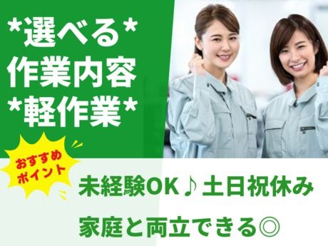 仕事内容 \ここがポイント/ ★未経験OK♪かんたん作業が中心 ★土日祝休み&家庭と両立しやすい職場◎ *・。・。*・。・。*・。・。* <仕事内容> 半導体関連企業での軽作業スタッフ募集! 組立・ピッキング・入出庫作業から選べます◎ 【組立】 ・機器と機器をケーブルで接続 ・TVとHDMIをつなぐ感覚に近い作業です 【ピッキング】 ・指示書に沿って部品を棚から集める ・カートで運んで段ボールに箱詰め 【入出庫作業】 ・トラックから届いた部品を棚に格納 ・出庫はピッキングと同じ要領で実施 指示書と棚に部品の位置が書かれているため、 覚えてしまえばとってもカンタン♪ ★スタッフの声★ 「保育園の送迎で遅刻・早退しても柔軟に対応してもらえる」 「書類対応も早くて安心。何でも聞ける雰囲気がある」 *・。・。*・。・。*・。・。*