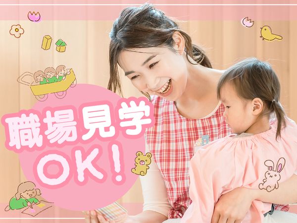仕事内容 20代~50代までさまざまな世代が活躍中! 自分の子どもが大好きだけど、  ̄ ̄ ̄ ̄ ̄ ̄ ̄ ̄ ̄ ̄ ̄ ̄ ̄ ̄ 保育士の仕事も大好き。  ̄ ̄ ̄ ̄ ̄ ̄ ̄ ̄ ̄ ̄ ̄ だからできるだけ、 長く働ける職場がいいなと思っていました。 そんな時に見つけたのが、 今働いている『企業主導型保育園』。 保育園=職場なので、 今では娘と一緒に出勤。 こんな感じで送りもお迎えもしてます♪ ▼8:29 登園 ▼8:30 勤務開始 ▼17:00 退勤 ▼17:01 お迎え 朝のバタバタやお迎えの焦りがなくなると、 こんなにも心穏やかに過ごせるのかと、驚いています! 子どもにも、目の前の仕事にも、 以前よりずっと優しく丁寧に向き合えるようになりました。 (保育士/30代・女性) ・ \企業主導型保育園ならではの魅力/  ̄ ̄V ̄ ̄ ̄ ̄ ̄ ̄ ̄ ̄ ̄ ̄ ̄ ̄ ̄ *定員19名の小規模な施設 *0~2歳の子どもたちとじっくり関われる *持ち帰りの仕事・残業ナシ *ブランクがある方も歓迎! ――――――――――――――― 仕事内容 ――――――――――――――― ■派遣先施設にて、保育業務全般を行っていただきます。 <具体的には…> ・送迎、お迎え ・朝の会 ・お着替え、お散歩 ・昼食準備、お昼ごはん ・お昼寝、おやつタイム など ※働く職場によって具体的な仕事内容は異なる場合がございます。 <POINT> ブランクがある方や経験が浅い方にも、ご経験に応じて働く職場をお選びいただけます。 『もっと自分に合う職場はないか』『給料や勤務時間などの待遇面に不満がある』 など、ご相談ください◎ 人気の認可保育園など、様々な職場をご用意してお待ちしております! <必須資格> 保育士資格、または幼稚園教諭免許をお持ちの方 ※ブランクがある方もOK!