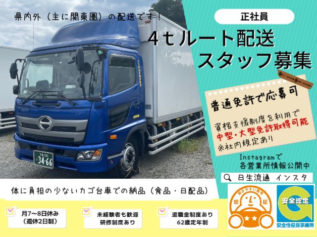 仕事内容 カゴ台車配送中心で体の負担少なめ。 18時 or 23時スタートが選べる夜型ルート配送です。 残業代100%支給・平均月収34万円以上の安定収入。 \普通免許からもスタート可能/ 資格支援制度(規定あり)を利用し、働きながら中型・大型免許を取得できます。 教習所に行っている期間中も給与発生しますので安心! 【研修制度】 研修専門のスタッフが(運転・座学)を独り立ちできるまでしっかりフォロー。 未経験の方も約3ヶ月程度でドライバーを目指せるシステムです。 免許取得まで座学や荷扱いなど行い、免許取得後から運転の知識を研修します。 \お気軽にお電話も歓迎!/ TEL/048-728-1582(正社員ドライバー採用係) 【職種】 〇ルート配送ドライバー ▼ルートドライバーの注目ポイント▼ 〇長時間運転なし 〇カゴ台車で楽々納品(検品無し) 〇月額302,780円~各種手当あり 〇平均月収346,544円(在籍340名) 〇残業代は別途全額支給 〇月7~8日はしっかりお休み 〇不況にも負けない安定した仕事量 〇複数の資格支援制度有→例)中型免許へのステップアップなど 〇働きやすい職場認証制度取得 〇30代・40代・50代活躍中! ///////////////////////////////////////////////////////////////// 【仕事内容】 4tトラックを運転して路面店などに日用品・食品を配達するお仕事です。 埼玉県内と埼玉県周辺エリアが中心。 固定ルートのため、一度覚えればルーティンワークとして働けます。 ・1日の配送件数:10店舗程度 ・カゴ台車使用/検品なし ・所定の場所に荷物を置くだけの納品スタイル 〇1日の流れ (1)営業所・物流センターで積み込み (2)2~3店舗へ配送 (3)センターに戻り再積み込み (4)1日2~4往復程度 【独り立ち後】 はじめは2~3便を担当して、スキルに合わせてコースを増やすなどステップアップ可能です。 独り立ち後も会社でバックアップしていきます。 未経験の方は極力日勤帯のお時間をご案内しております。 【採用ホームページはこちら】 日生流通運輸倉庫株式会社 https://entori.jp/nissei-ryutsu-seishain
