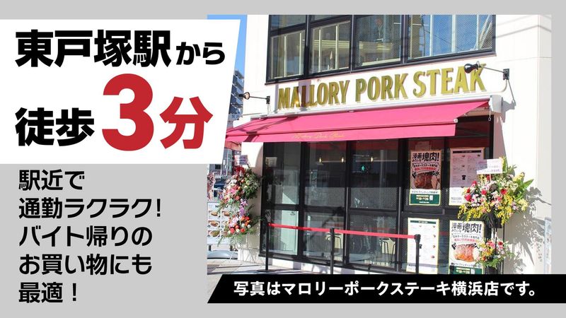 仕事内容 ⭐このお仕事のポイント⭐ ●メディアでも多数取り上げられている 巨大ポークステーキがまかないで食べられる! ●週2日~、1日4h~シフト自由! ●東戸塚駅徒歩3分の駅チカ店舗! ●髪色自由!ネイルもOK! ⭐学生さんの初バイトにもオススメ⭐ ✅学校帰りからの勤務OK! ✅週2日からOK! ✅バイトデビュー歓迎! ✅友達との応募もOK! ✅同世代のお友達が欲しい方も◎ ━━━━━━━━━━━━━━━━━━━━ ⭐フリーターさんも大歓迎⭐ ✅シフト自由!WワークもOK! ✅経験者優遇! ✅フルタイムで稼ぎたい方も大歓迎! ━━━━━━━━━━━━━━━━━━━━ ⭐主婦(夫)さんも大歓迎⭐ ✅家庭と両立しながら短時間勤務もOK! ✅扶養内で無理なく仕事復帰もできる♪ ━━━━━━━━━━━━━━━━━━━━ ⭐お仕事内容⭐ ✅接客 お客様のご案内や、セルフオーダーの説明、お会計など まずは元気に「いらっしゃいませ!」と 「ありがとうございます!」が言えたらOK! ✅キッチン 食材のカットや盛り付けなど、簡単な調理をします。 包丁を持ったことのない方も大丈夫! 簡単な業務から初めて少しずつできる作業を増やしていきましょう! ✅洗い場 使用済みの調理器具や食器の洗浄をします。 食洗気があるので、軽く洗い流すだけでOK! ✅バッシング・清掃 空いたお皿を下げたり、お客様が退席したあとの片付け、 忘れ物の確認をします。 ━━━━━━━━━━━━━━━━━━━━ 少しでも気になった方は応募ボタンをクリック♪ ━━━━━━━━━━━━━━━━━━━━
