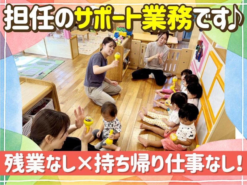 仕事内容 <平日のみ!8:30~13:00までの勤務!> 資格を取ったばかりの方や経験が浅い方でも大歓迎です! しっかり先輩スタッフがサポートします! ~仕事内容~ 保育士の補助業務をお願いいたします。 ・保育補助 ・掃除 ・玩具の消毒 ・散歩の付き添い <担任の先生のサポート業務!> あくまでも補助がメインです! 保護者対応や書類作成はありません◎ 正社員が担当するのでご安心ください◎ 残業や持ち帰りもなく、 スタッフは終わり次第すぐに退勤しています! ~1日のスケジュール~ ■8:30~10:00 ・園庭の掃除 ・オムツ、着替え等の補充 ・給食メニューの記入 等 ■10:00~10:40 ・散歩の付き添い ・保育補助 ・お部屋でおもちゃの消毒 等 ■10:40~12:00 ・給食等の準備 ・保育補助 ■12:00~13:00 ・給食の片づけ ・掃除 ・午睡時の見守り ■13:00退社 ~当園について~ 園児は1歳児(10名)・2歳児(10名)の20名です。 1歳児クラスは正社員が3名、パート1名、2歳児クラスは正社員が2名、パート1名体制と ゆとりあるスタッフ体制です。 少人数なのでとても穏やかな雰囲気! 歌をうたったり、園庭でシャボン玉を飛ばしたりとほんわかしています。 ゆっくり時間が流れているような、和やかな雰囲気の職場です。 ~穏やかなスタッフ多数!~ 平均年齢45歳!20代、30代、40代、50代、60代まで幅広い年代が活躍中です。 全員で11名(男性1名、女性10名)在籍しています。 スタッフ同士の仲もよく、みんなで楽しく働いています。 60代以上のシニアの方も歓迎です! ~午前帯の勤務で家庭とも両立◎~ 子育て中の主婦の方も3名活躍中です! お子さんがいるスタッフが活躍しています!