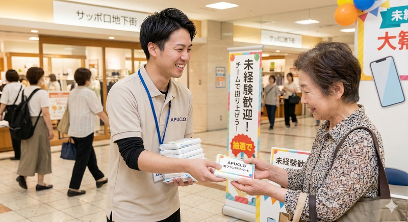 仕事内容 「ただのバイト」はもう卒業! 仲間と盛り上がりながら、しっかり稼げる「チームの着火剤」募集中! ✅あなたにお任せしたい役割 ① 「きっかけ」を作る笑顔のパス! ショッピングモールなどの特設ブースで、チラシや景品をお渡ししながら「今、抽選会やってるんです!」と、お客様にお声がけをします。 難しい説明は一切不要。あなたの明るい挨拶が、すべてのスタートになります! ② 盛り上げ担当(ムードメイカー) 仲間が成約したときに自分のことのように喜び、チームの士気を高める役割です。 「今の話し方、最高だったね!」「次、僕がお客様を連れてくるね!」そんな一言で、現場の温度を1度上げる。 そんな姿勢を何よりも評価します。 ③ 最高の「バトンタッチ」 興味を持ってくださったお客様がいたら、そこから先は社員へ交代! 「あとはプロに任せた!」と笑顔でバトンを繋ぐまでがあなたのミッション。 契約などの難しい業務は担当しないので、あなたは「目の前の人を笑顔にする」ことだけに100%集中できます。 ✅輝ける理由 現場には、1次代理店ならではの、「ノウハウ」があります。 「なんて話しかければいい?」という初歩的な悩みから、 お客様をその気にさせるトーク術まで、すべて言語化されているので、初日から迷わず活躍できます! ✅アピールポイント ◆ 1.5時間ごとに「お給料が出る休憩」あり 「ずっと立ちっぱなし、話しっぱなし」はさせません。 1.5時間ごとに5〜10分の小休憩を挟みます。もちろん休憩中も時給は発生! ◆ 休み希望は100%通ります! 学業やプライベートを優先できる「アプクロ流」の働きやすさです。
